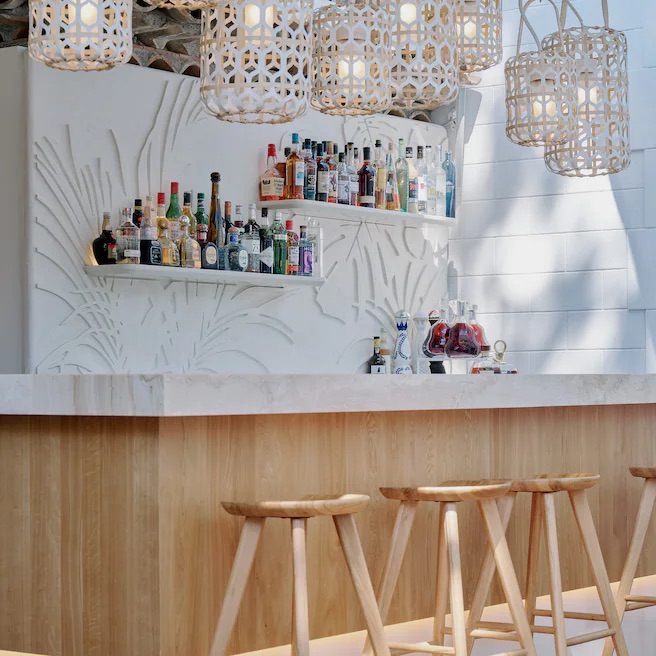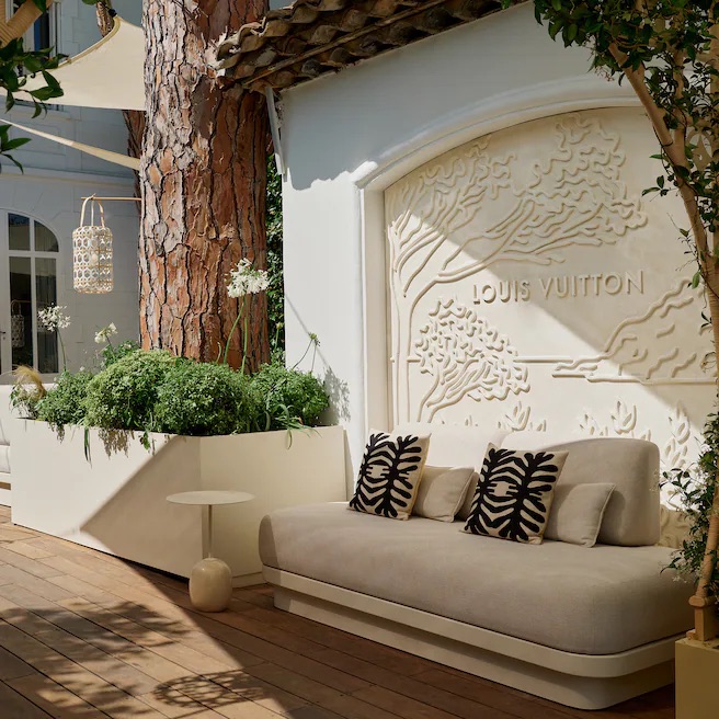 Terasa je polna kosov iz kolekcije Louis Vuitton Objets Nomades, kot so viseče lanterne iz usnja, ki ponoči mečejo medlo svetlobo in ustvarjajo posebno vzdušje.