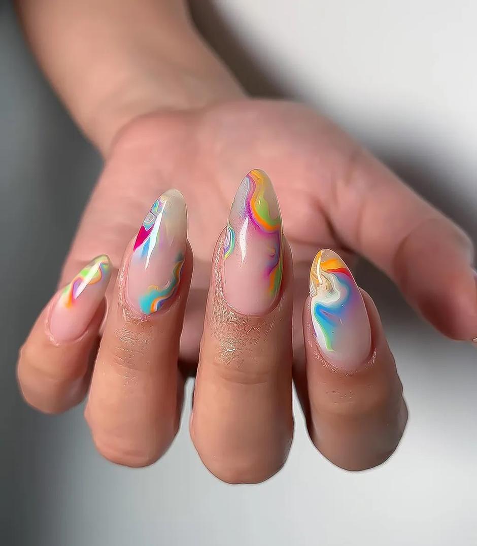 Kul stvar pri tej vrsti manikure je, da noben noht ni nikoli enak in ena barva vedno bolj izstopa kot druga. Če imate radi zabavne dizajne na rokah, lahko marmorne nohte kombinirate z drugimi vzorci in barvami. Nič ni prepovedano, barv na rokah pa, sploh v toplejših dneh – ni nikoli dovolj!