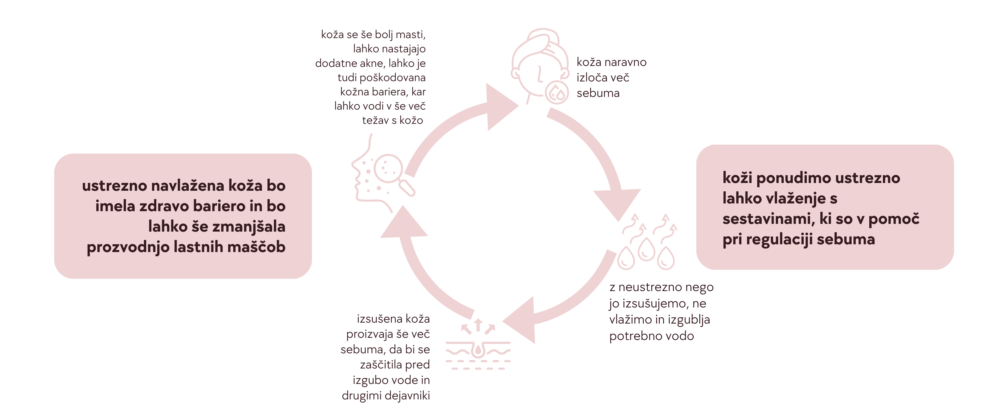 Koža se bo namreč še bolj trudila zaščititi pred izgubo vode in se bo še bolj mastila, posledično pa lahko nastajajo tudi akne. Rešitev je v ustreznem vlaženju, prilagojenemu tipu kože, ne izsuševanju in odrekanju vlažilnim izdelkom. Izberemo lahke, vodnate izdelke (serumi, fluidi) z ustreznimi sestavinami, ki vlažijo, a obenem pomagajo tudi pri regulaciji sebuma (npr. vitamin B3 – niacinamid).