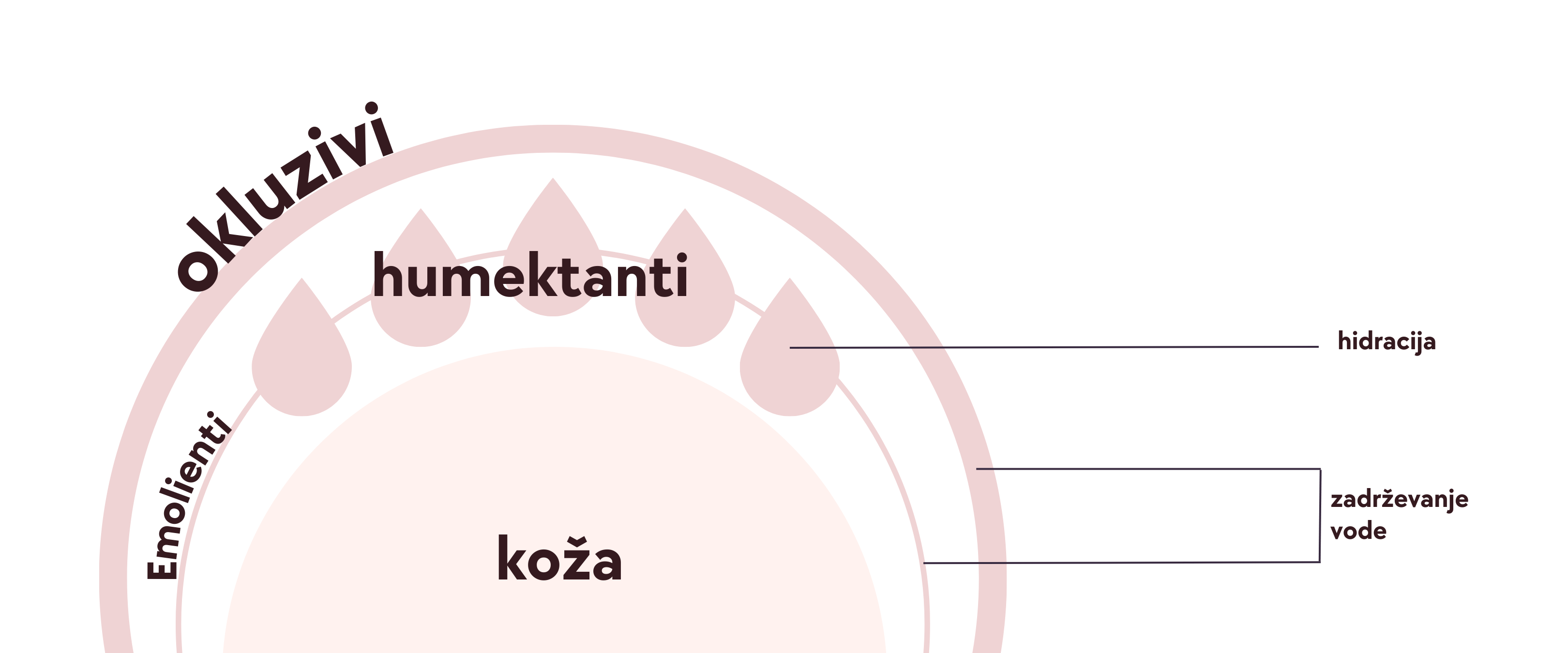 - Zadrževanja vode v koži oz. poljudno “zaklepanje vode” s sestavinami (emolienti in okluzivi), ki preprečujejo izhlapevanje vode in kožo tudi ščitijo ter negujejo.