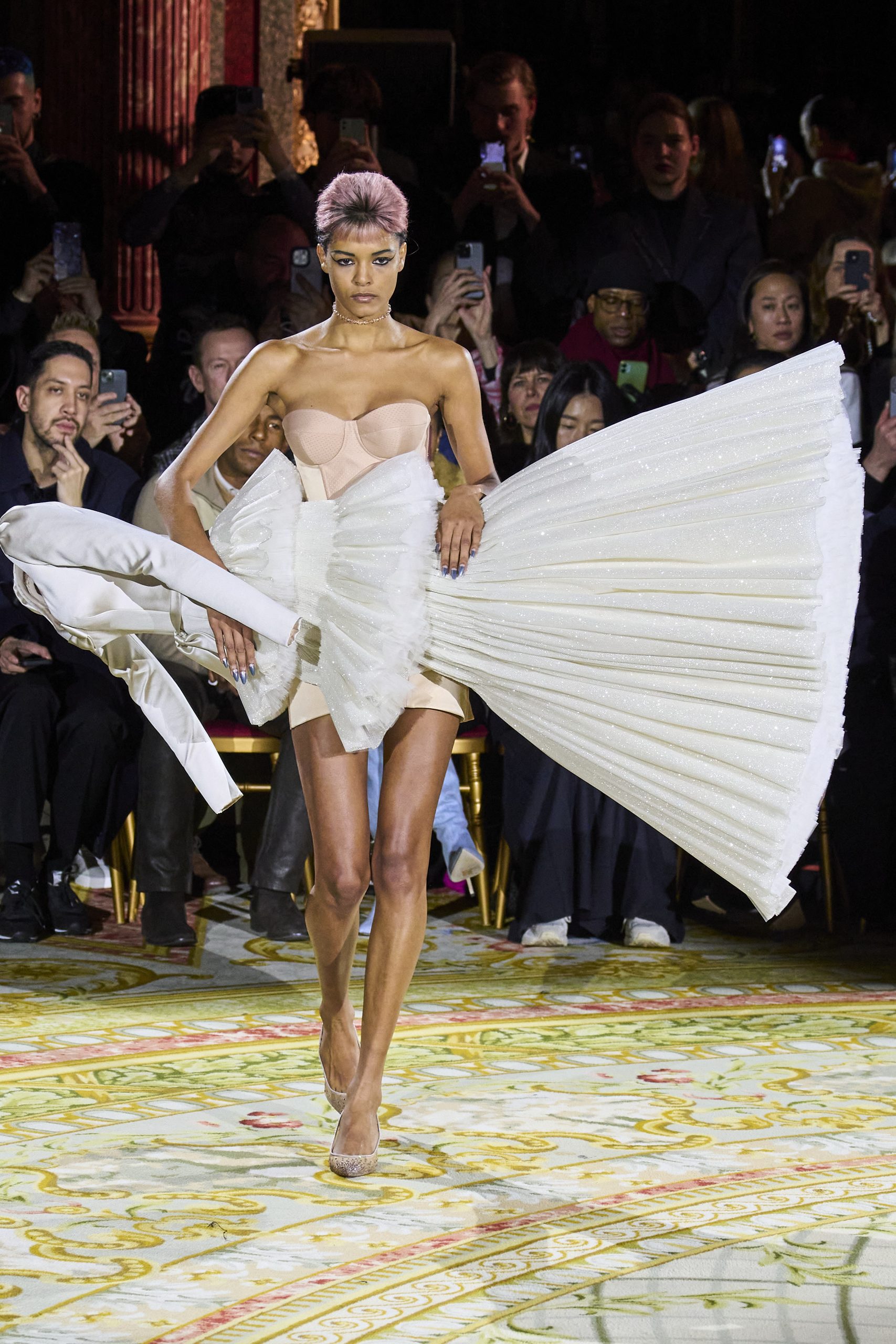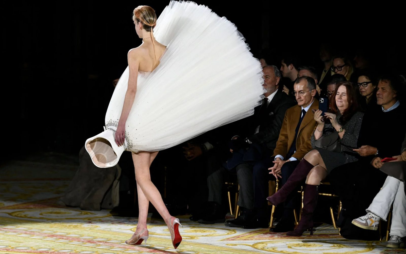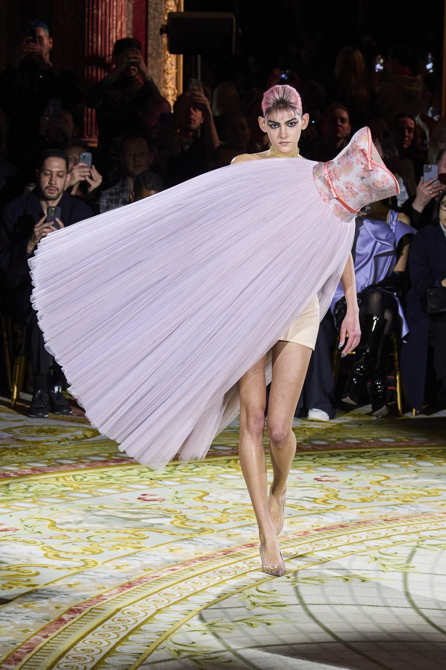 Na modni reviji pomlad/poletje 2023 so se manekenke po pisti sprehodile v princeskastih oblekah iz tila, ki so bile obrnjene v vse smeri.