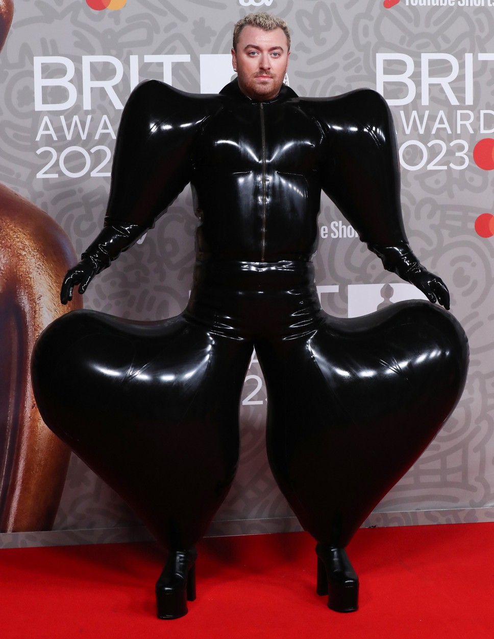 Po grammyjih, kjer so glasbeniki malodane tekmovali, kdo bo s svojim izborom oblačil najbolj šokiral, smo tudi na rdeči preprogi videli ekstravagantne, naravnost smešne videze. Sam Smith je nosil povsem črno obleko iz lateksa, ki je spominjala na umetniška dela Jeffa Koonsa. Balonski kombinezon z močno poudarjenimi rameni in srčasto obliko hlačnic je kombiniral še rokavicami ter gležnjarji z visoko peto.