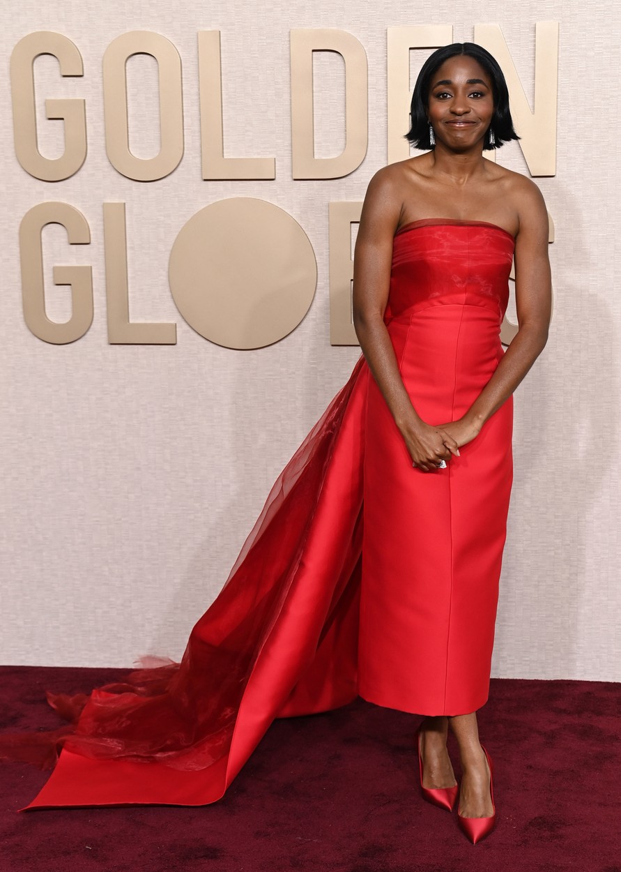 Nekoliko drugačne kroje oblek sta izbrali Ayo Edebiri in Selena Gomez. Ayo je izbrala oprijeto obleko rez naramnic z dolgo vlečko znamke Prada, Selena pa asimetrično satenasto obleko s črnim pasom znamke Armani Prive. Julianne Moore vse je odločila za klasiko znamke Bottega Veneta.