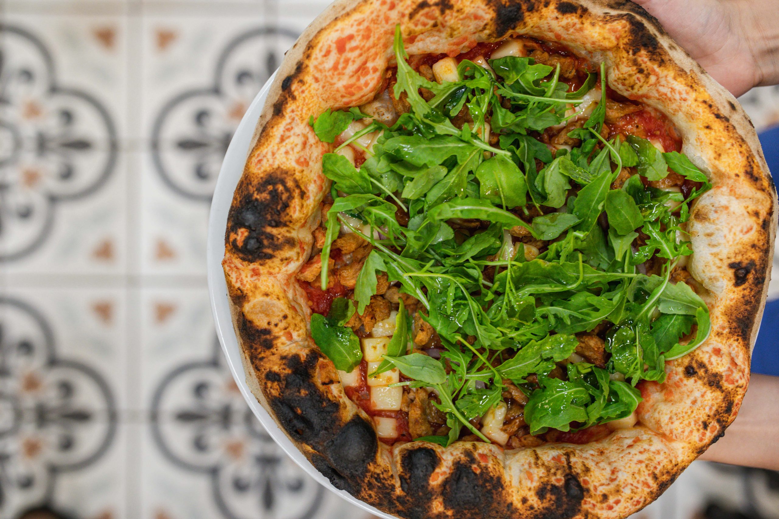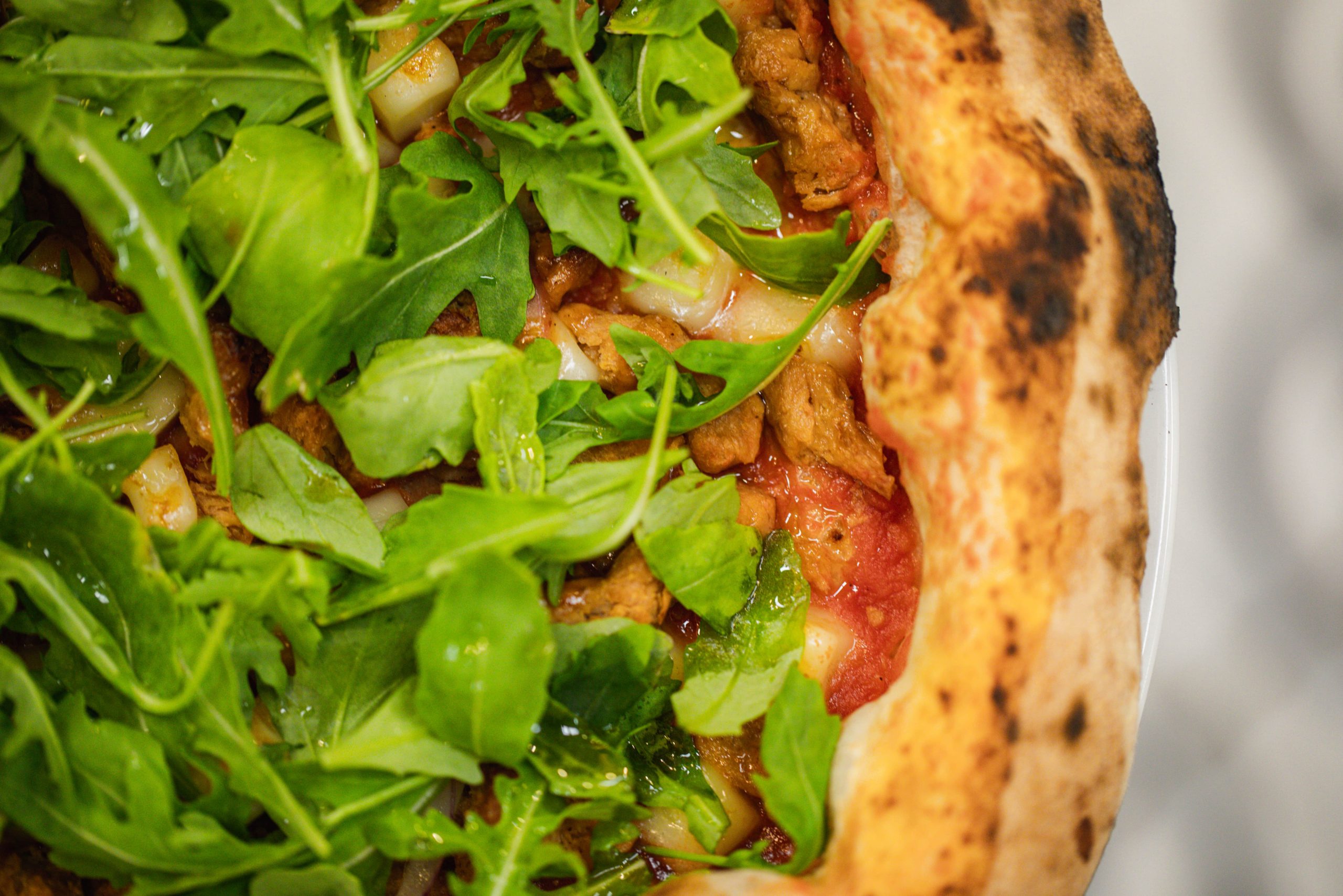 Testo zori 48 ur, in zato ima hrustljavo skorjico in mehko, zračno sredico. Spremljajo ga vrhunski pelati San Marzano, apetiten česen v oljčnem olju, hrustljavo pečeni kosi veganskega piščanca Amaze, rdeča čebula, veganska mocarela in sveža rukola – prava testena blaženost in popoln začetek naše današnje ture.
