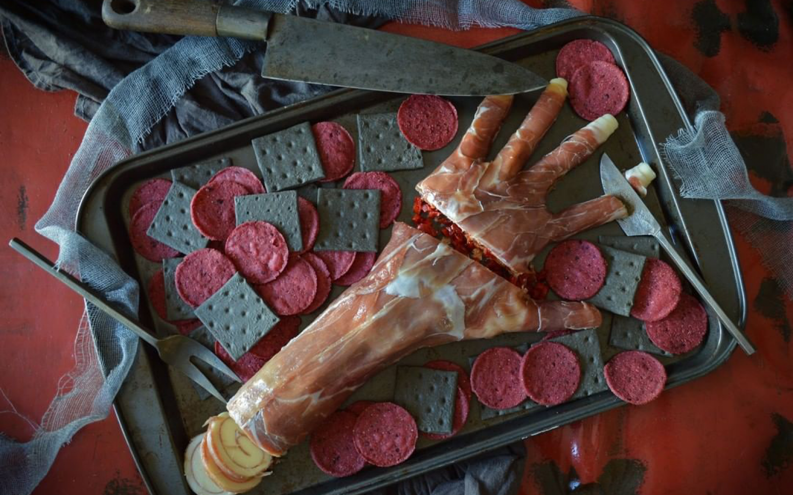 Ustvarite skrajno realistično in izredno srhljivo roko brez kože, ki jim bo pognala strah v kosti! Brez skrbi, v resnici gre za pladenj s sirom in pršutom, ki ga lahko okrasite s krekerji ali grisini.