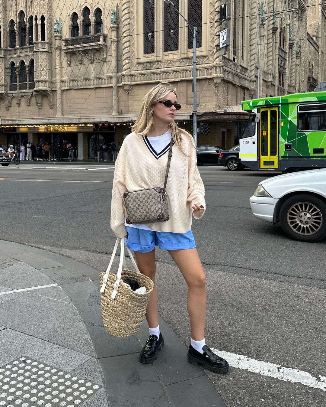Obožujemo nasprotja. Široki moški puloverji in brezrokavniki z V-izrezom (z ali brez neizogibne bele majice pod njimi) nas bodo dovolj greli, da lahko lahke kratke hlače nosimo z balerinkami ali supergami.
