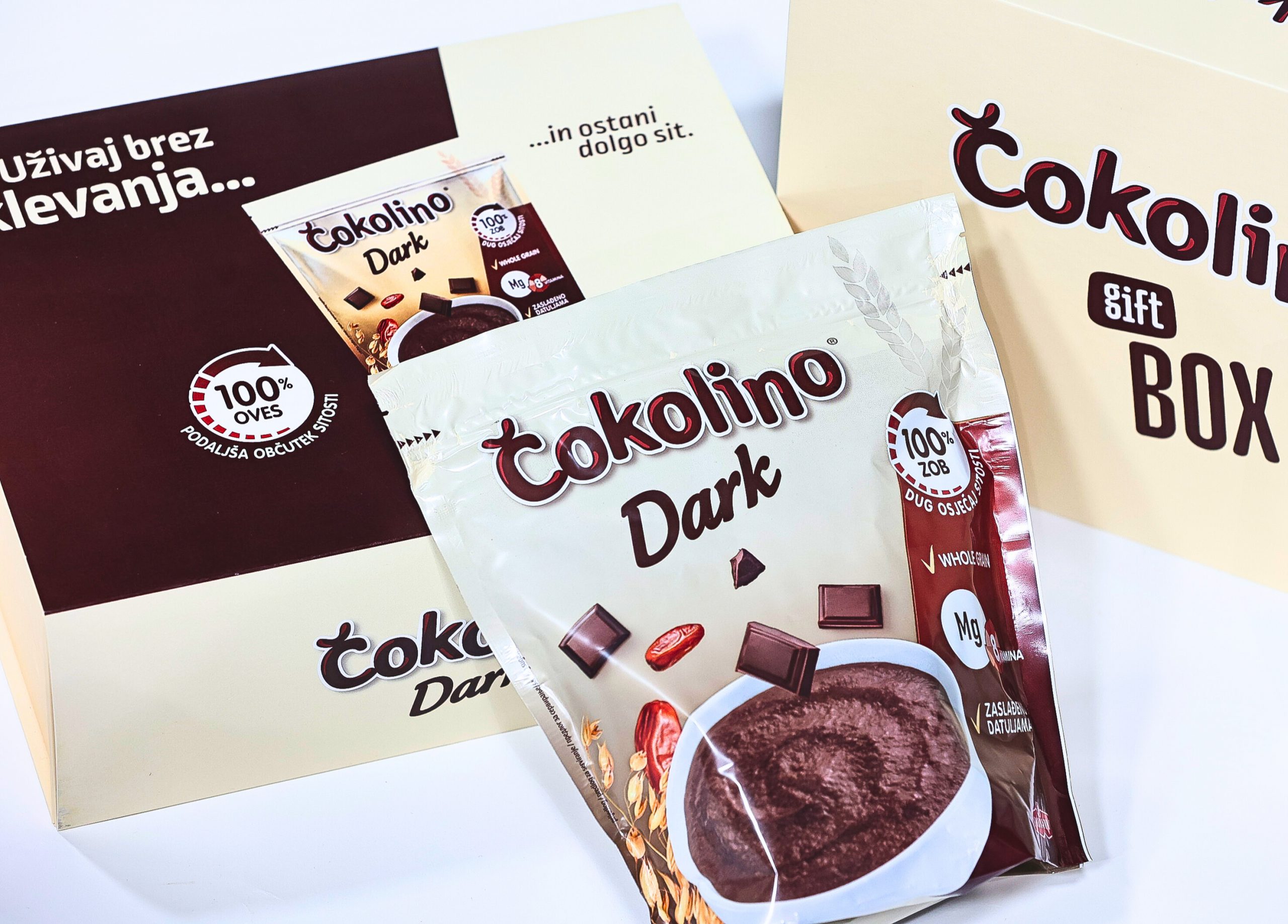 Čokolino Dark ne vsebuje klasičnega sladkorja, sladkan je namreč samo z datlji. Podaljšan občutek sitosti ustvari 100-odstotna polnovredna ovsena moka.