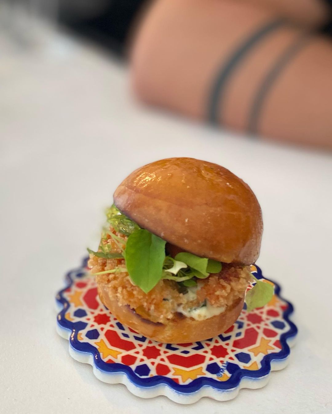 Nato so sledile tri tople predjedi: gyoze s svinjino in kozicami, taco s hobotnico in mini burger s kozico in wakame algami. Naš favorit je bil vsekakor burger – ocvrta kozica s svežo majonezno omako in wakame algami v majhni brioche bombetki. Okusen in inovativen burger z azijskim pridihom, ki naju je oba izjemno navdušil. Kombinacija slanega, sladkega in morskega, ki te res ne pusti ravnodušnega.