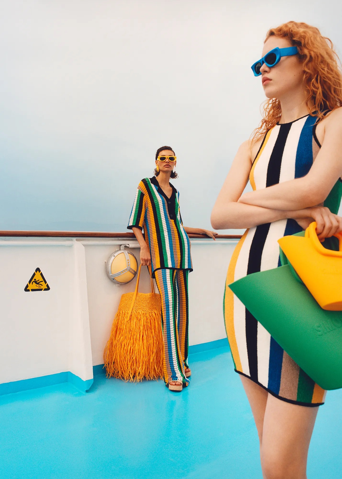 V kolekciji najdete tudi zabavne dodatke, kot so barvite torbice, uhani v obliki koral in biserov, veliki klobuki iz rafije, značilne sandale s platformo ter sončna očala nenavadnih oblik – vse, oblikovano tako, da odraža estetiko morskega dna.