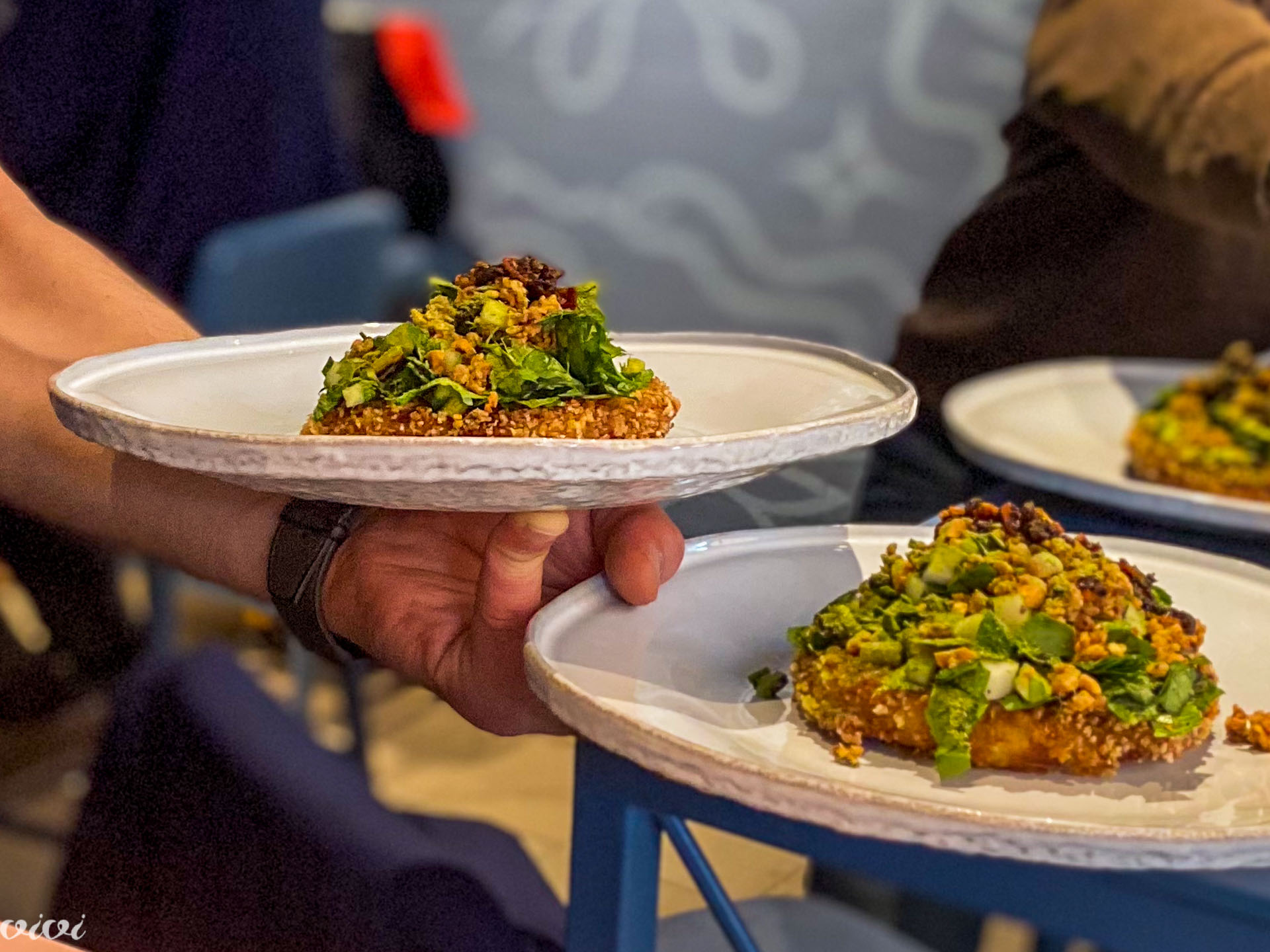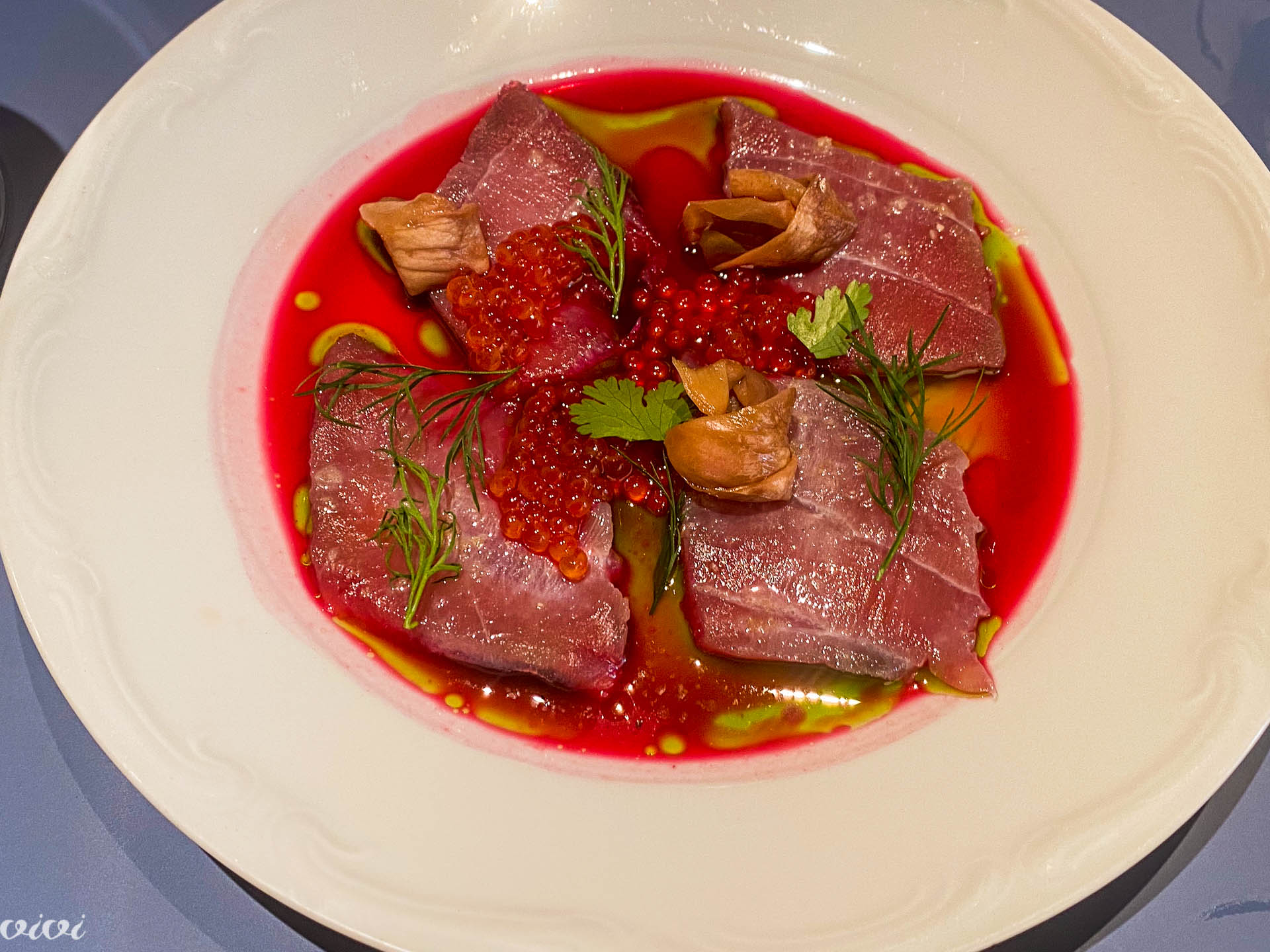 Po njihovih predlogih naj bi bile dve jedi dovolj za eno osebo, zato sva s sodelavko naročili štiri različne jedi. Prva je na mizo prispela tuna s peso, dashi omako, magnolijo in ikrami. V tokratni recenziji mi bo po vsej verjetnosti zmanjkalo superlativov za opis jedi, ker ta je bila le prva izmed vseh, ki so naju izjemno navdušile. Sveža tuna se je izjemno dobro podala k rahlemu zemeljskemu okusu pesinega soka, ki je bil pomešan z dashi omako. Ikre so celoten okus obogatile s sočno sladkobo, magnolije pa dodale nek zanimiv okus, ki ga kar težko opišemo, a je bil vsekakor odličen. Predvsem bi pohvalili omako, v katero sva tudi potem, ko je tune že zmanjkalo, še vedno pomakali fokačo.