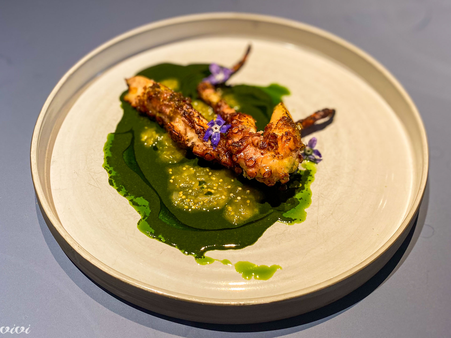 Zadnja jed, ki je prispela na mizo, je bila hobotnica na žaru s čemažem, x.o. in tomatiljo. Iskreno povedano, ne vemo, kaj je x.o., a sklepamo, da nekaj kislega, saj je imel čemaž, v katerem je bila servirana hobotnica, rahlo kisel priokus. Hobotnica je bila sveža in mehka ter celo malce hrustljava, kar je vedno dobro. Za čemaž pa si upam trditi, da je klasika, ki se poda k vsemu, predvsem morski hrani. To jed bi ocenila še za najbolj preprosto, a nič manj odlično.