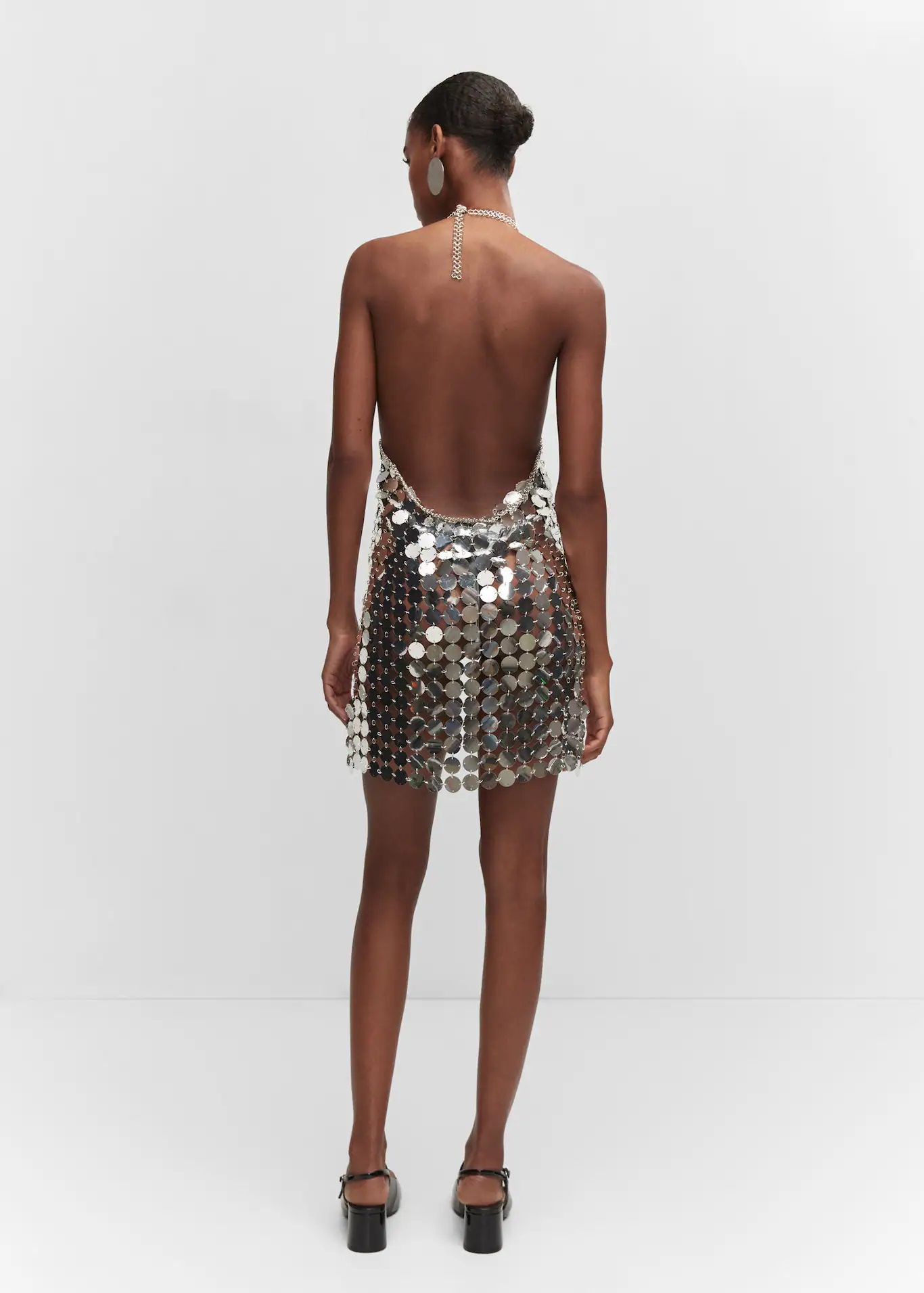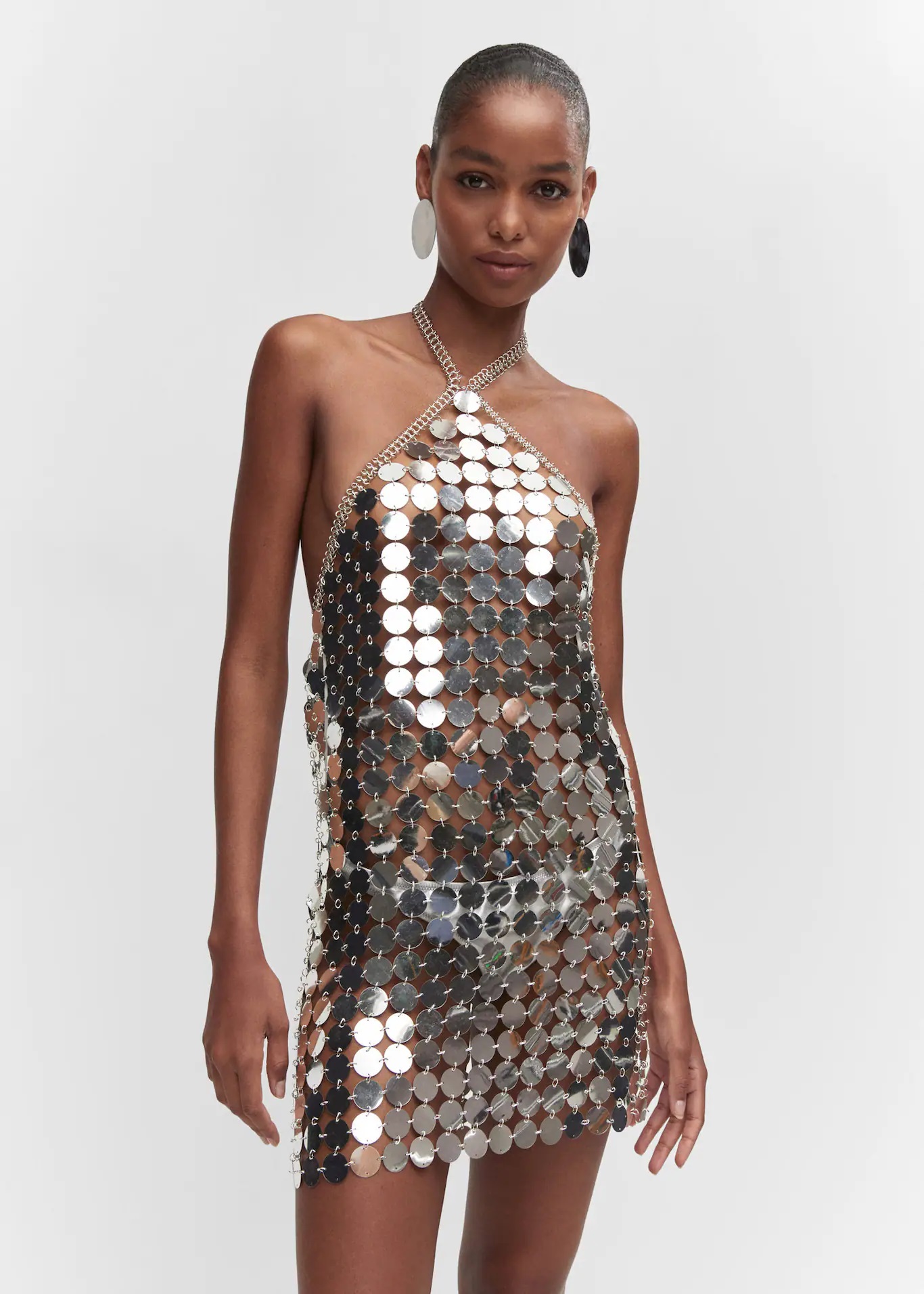 Obleka nas spominja na disko dobo 80. in 90. let in je krojena tako, da se prilega vaši postavi. Narejena je iz velikih srebrnih bleščic, ima odprt hrbet, s tanko srebrno verižico pa se zapira na vratu.
