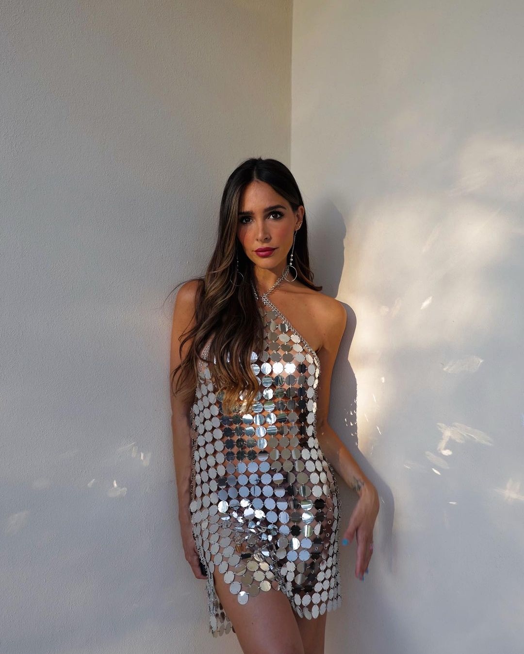 Obleka nas spominja na disko dobo 80. in 90. let in je krojena tako, da se prilega vaši postavi. Narejena je iz velikih srebrnih bleščic, ima odprt hrbet, s tanko srebrno verižico pa se zapira na vratu.