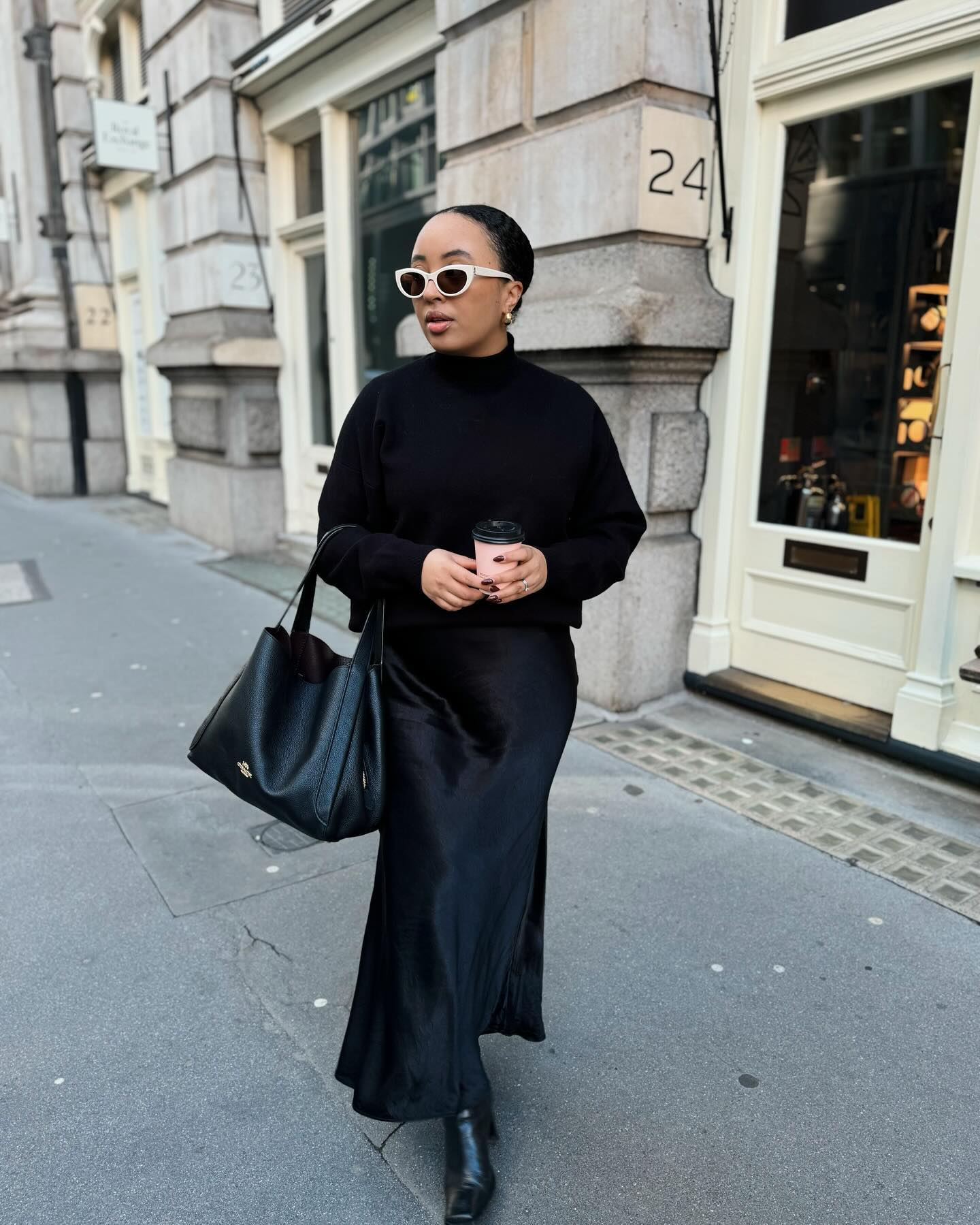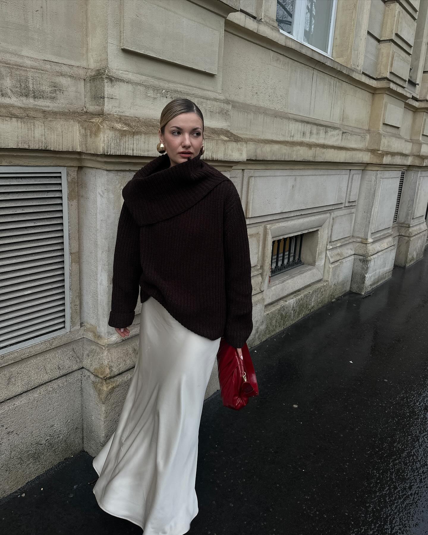 V kombinaciji z debelim puloverjem bo videti izjemno šik in kljub temu še vedno primerno za hladne dni. To dokazuje hrvaška vplivnica Marija Čamber, ki je belo satenasto krilo kombinirala s črnim oversized puloverjem s priljubljenim debelim ovratnikom.