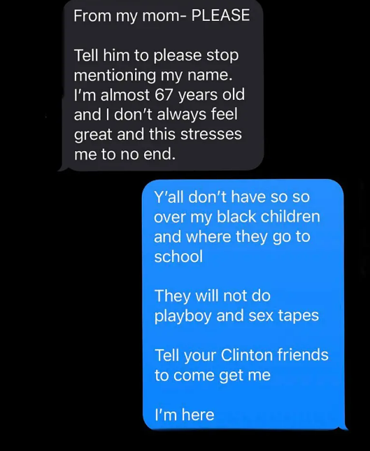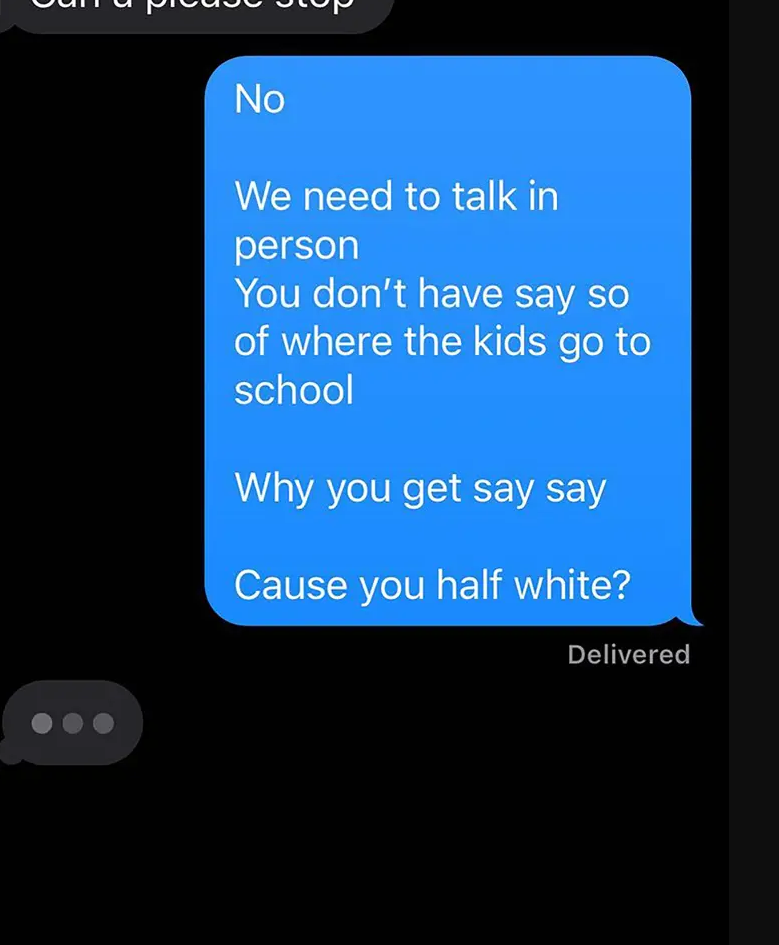 “Ne, pogovoriti se morava osebno, nimaš besede o tem, katero šolo bodo obiskovali najini otroci. Zakaj bi morala tvoja beseda obveljati? Ker si napol bela?” je v sporočilu napadel Kim.