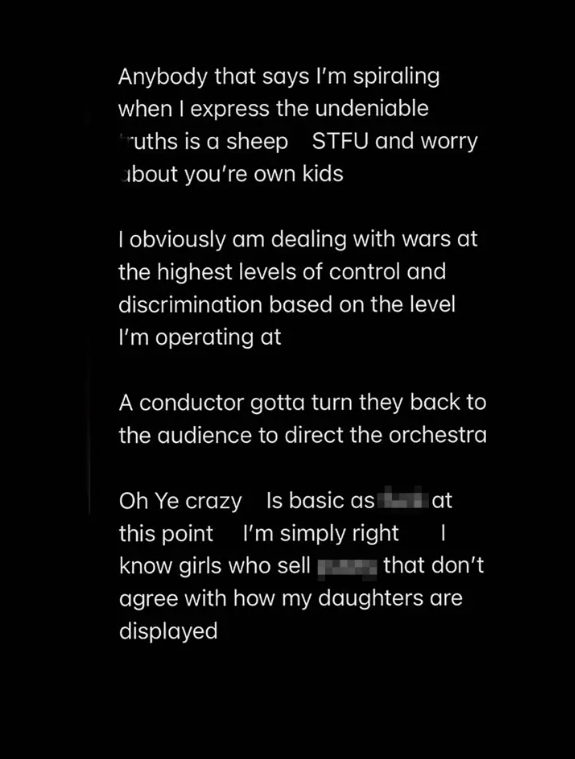 Vsakdo, ki pravi, da se vrtim v spirali, ko izražam nesporne resnice, je ovca,” je Kanye zapisal v še eni objavi in ljudem rekel, naj “utihnejo in skrbijo za njihove lastne otroke”.