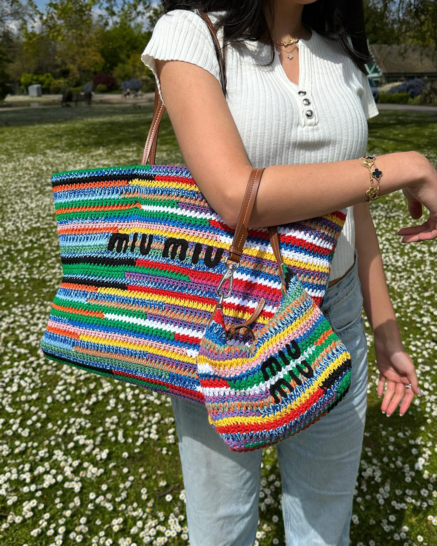 Loewe vsako poletje poskrbi za “it” cekar sezone, letos pa mu konkurenco dela Miu Miu, ki navdušuje s svojimi barvitimi pletenimi torbicami.