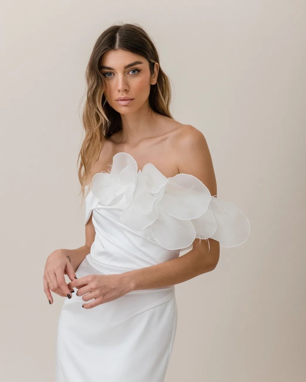 Mi smo se na vso moč zaljubili v kratko obleko, ki ima na sprednji strani veliko elegantno rožo – vsekakor kreacija, ki ne bo ostala neopažena!