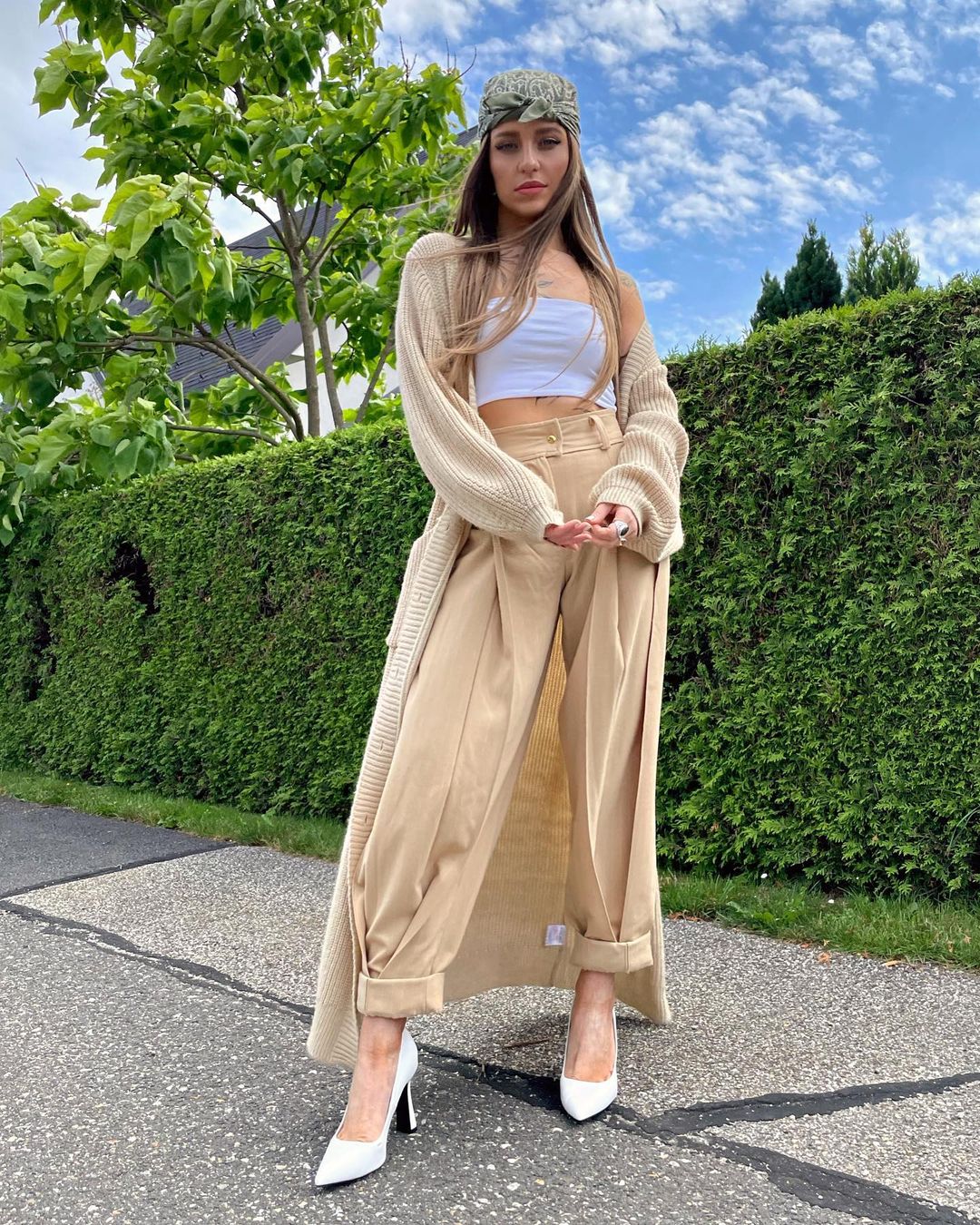 Kombinirala jo je s širšimi hlačami v istem “safari” odtenku, zraven dodala odrezan top, za piko na i pa še bele salonarje in naglavno ruto. Zelo všečno.