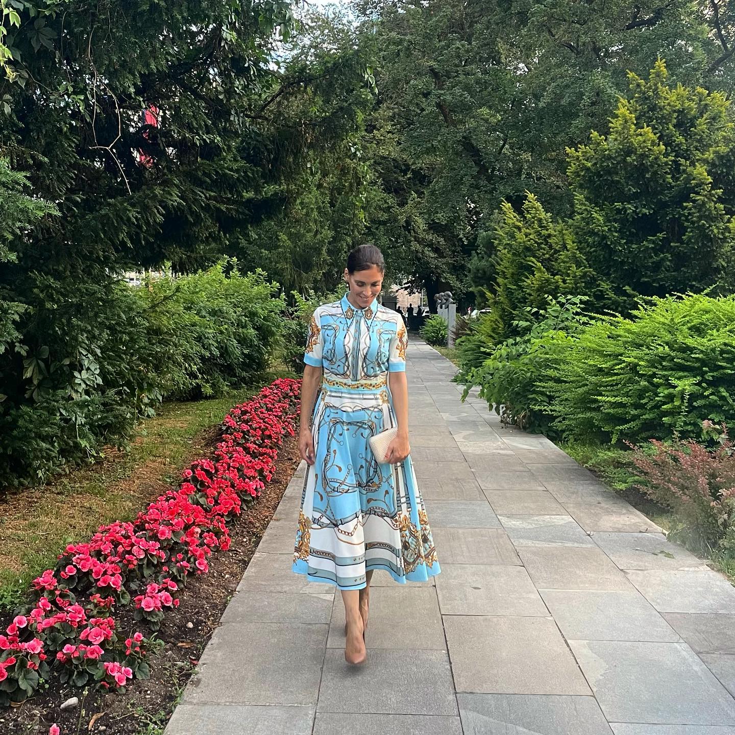No, nas je navdušila za opravo ob dnevu državnosti, ko je izbrala vzorčasto obleko z modrimi in zlatimi potiski, zraven pa kombinirala klasične salonarje v bež barvi.