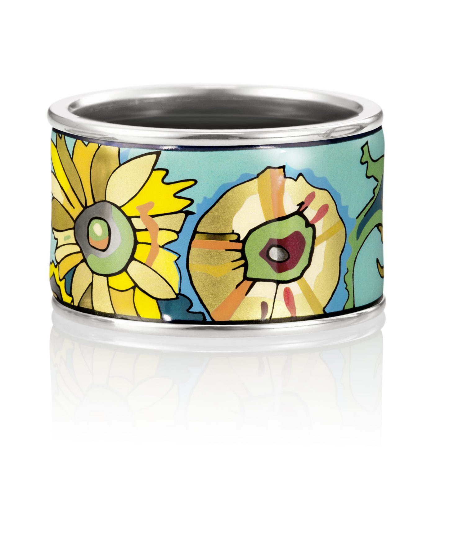 Freywille dizajn Fleur D’or Jour oživi sončnice na sanjavi, turkizni podlagi v polni moči. Čednost poletja, veselje in lepota narave se odražajo v rapsodiji rumenih do oranžnih odtenkov, ki obarvajo cvetne liste bujnih cvetov.