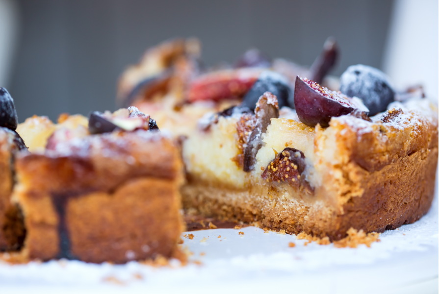 - Fige nežno potisnite s prerezano stranjo navzgor v mandljevo mešanico. Pecite 75 minut ali dokler ne postane masa zlata (ne skrbite, če se sredica še vedno zdi mehka – testo je lahko malce mehko). Pustite v modelu 15 minut, nato odstranite stranice in prenesite na rešetko, da se ohladi.