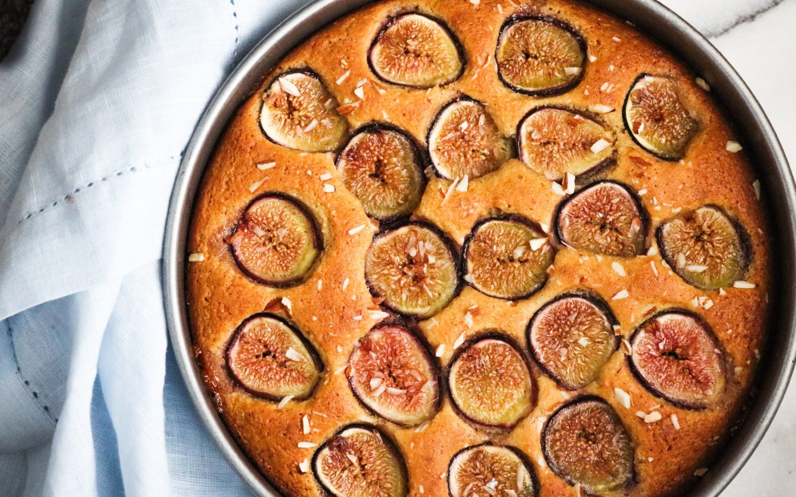 - Fige nežno potisnite s prerezano stranjo navzgor v mandljevo mešanico. Pecite 75 minut ali dokler ne postane masa zlata (ne skrbite, če se sredica še vedno zdi mehka – testo je lahko malce mehko). Pustite v modelu 15 minut, nato odstranite stranice in prenesite na rešetko, da se ohladi.
