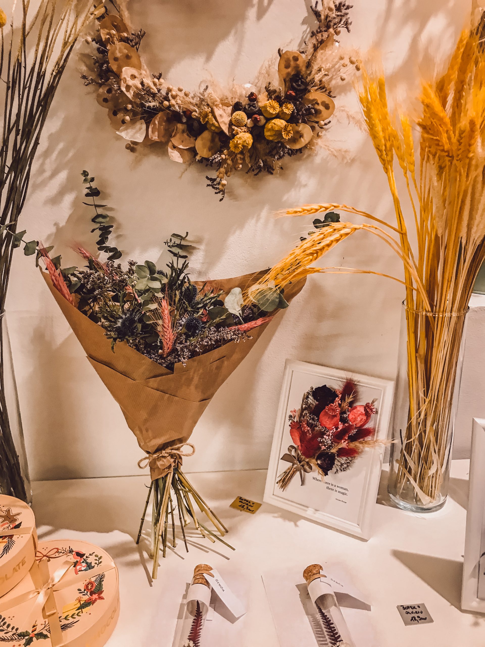 Večen šopek oz. šopek iz suhega cvetja, ki je popisan z ljubeznijo, eleganco in lepoto. Danes, ko želimo skrbeti za okolje in se vsi nagibamo k bolj trajnostnemu pristopu, so rože iz suhega cvetja pravi korak v smeri proti trajnostni naravnanosti. Ne samo to! Šopek bo mama imela za vedno in vsakič, ko ga bo pogledala, se bo spomnila na vas in čudovito darilo, ki ste ji ga podarili. Suho cvetje je vedno večji hit v Sloveniji, za bolj drzne mame, ki ga bodo postavile na najbolj viden del hiše, pa izberite divje barve.