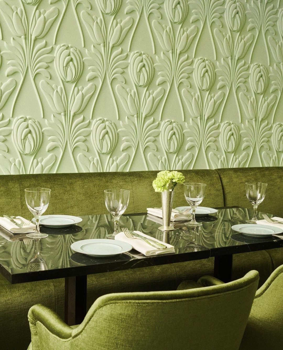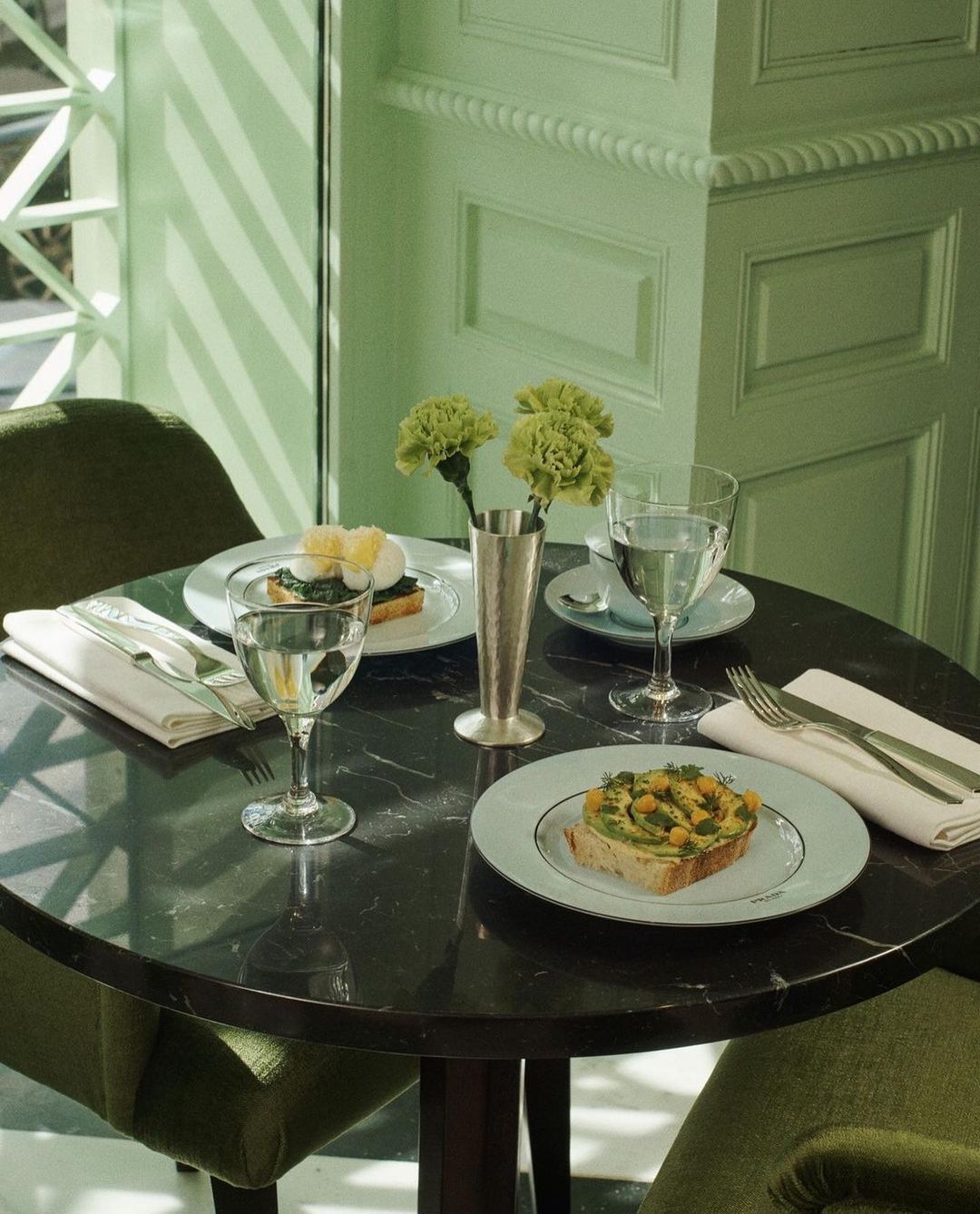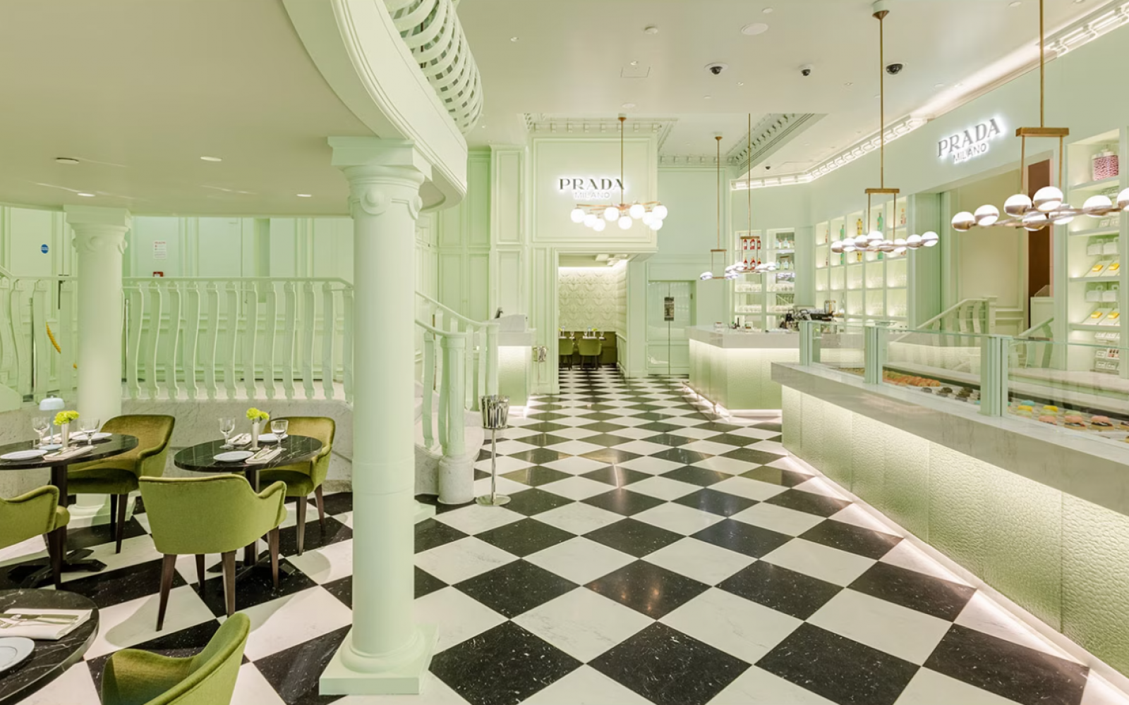 Eleganten in razkošen prostor poudarja Pradine vizualne značilnosti, pri čemer vsaka izbira, od dekoracije in menija do krožnikov in vzdušja, odraža jezik, pristop in poseben način, ki ga uporablja znamka. Stene, stropi ter z žametom oblazinjene zofe in fotelji so odeti v ikonično zeleno barvo.