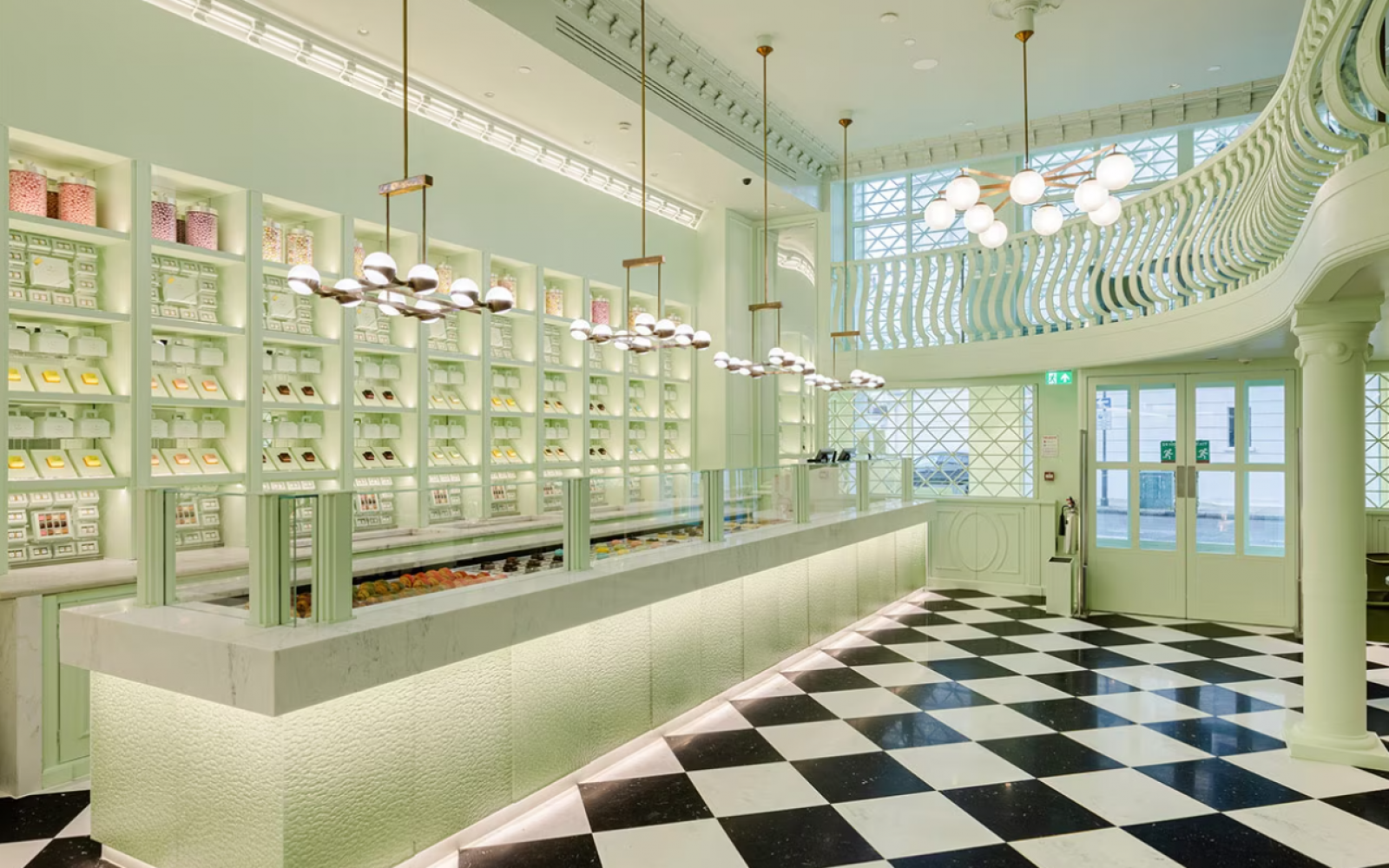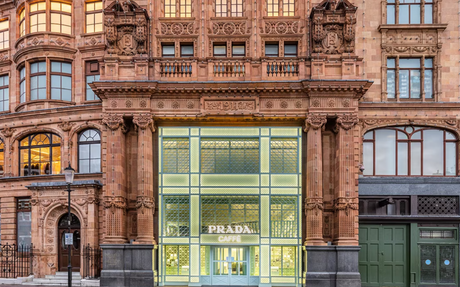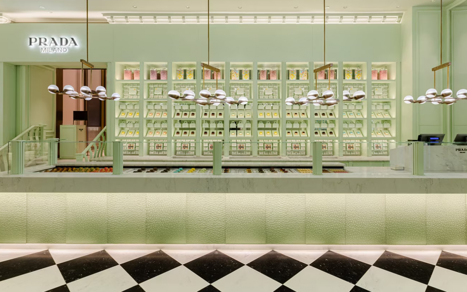 Tla z vzorcem šahovnice posnemajo tla zgodovinske stavbe butika na ulici Galleria Vittorio Emanuele II v Milanu, medtem ko cvetlični basreliefi na stenah spominjajo na nekatere Pradine vodilne trgovine po vsem svetu.
