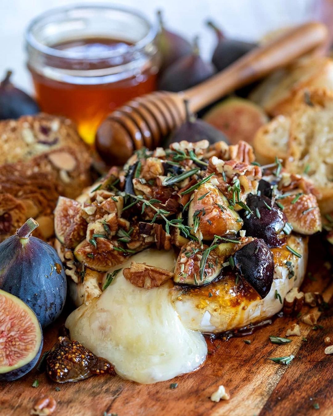 Pečen Brie z medom, figovo marmelado in svežimi figami je enostavna, a elegantna predjed. Topel, lepljiv in zrel slani brie se odlično dopolnjuje s sladkim medom.