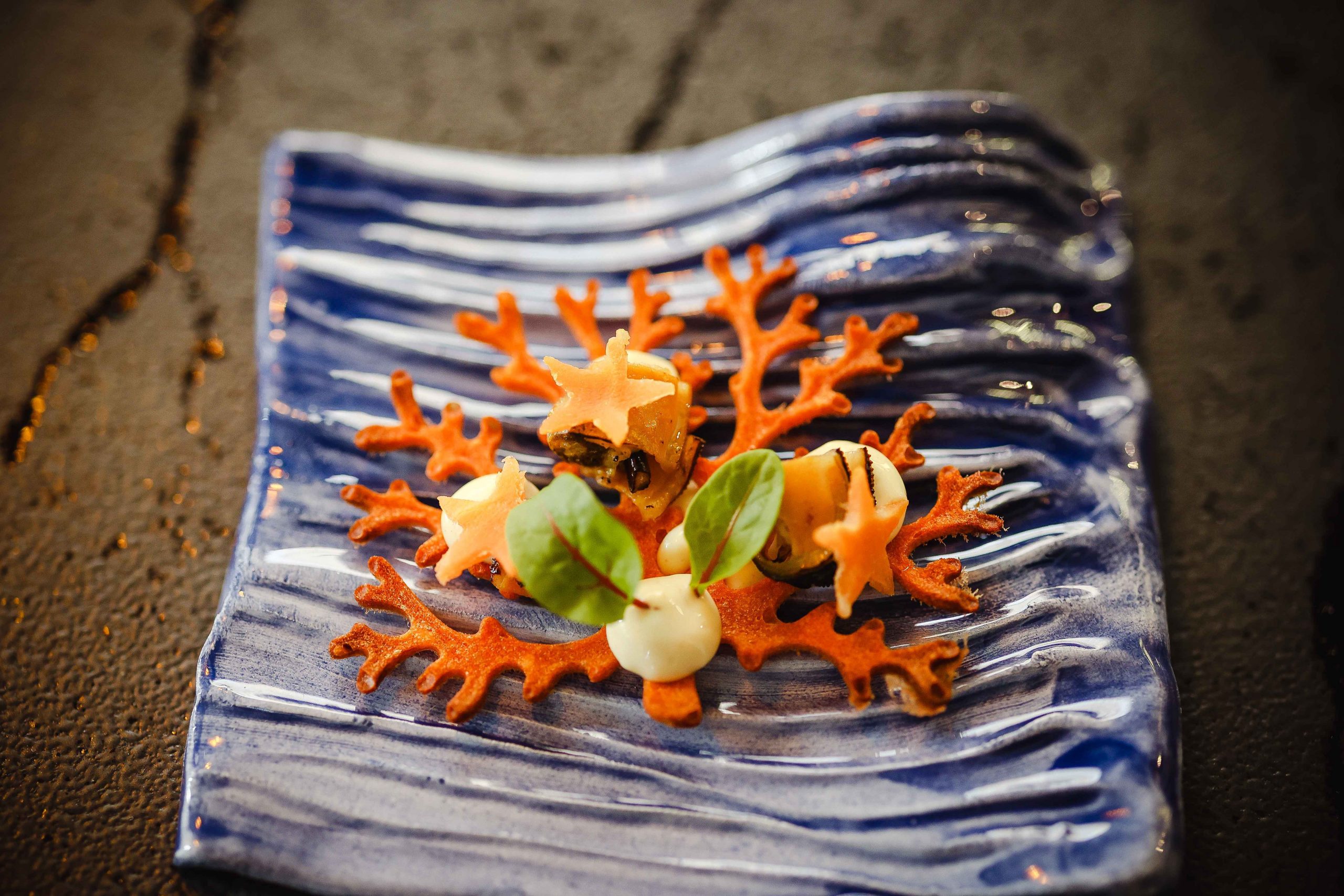 Ena najbolj vizualno dovršenih jedi je bila pedoči s kremo iz buzare, zvezdicami okisanega korenja položeni na čips paradižnika v obliki korale. Pozdrave sta zaokrožili sardela v šavorju s tremi teksturami čebule in cvetnim prahom ter bombetka in mediteranska pogača, na katero smo namazali božansko maslo z olivnim oljem ter olivni humus s kokicami ajde.