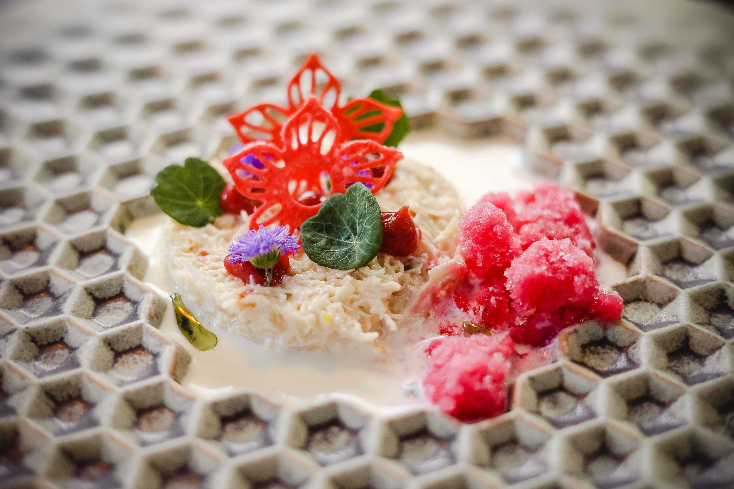 Z dodobra ‘ogretimi’ brbončicami je visoka pričakovanja za nadaljnje pokušanje postavila solata iz svileno mehke rakovice, dimljene smetane s creme fraiche in fermentirano limono, ki jo je odlično zaobjela osvežilna granita iz rabarbare, s čimer smo se strinjali vsi za našo mizo.