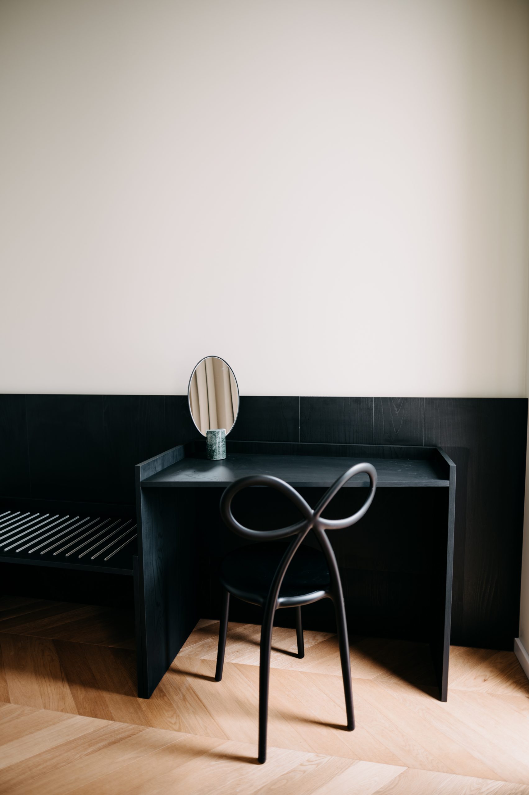 Ikonični oblikovalski kosi so odlična poživitev sicer minimalističnega dizajna pomešanega s pridihom pariškega šika. Zaznamujejo ga črna, bela in modra barva v kombinaciji s svetlim lesom.