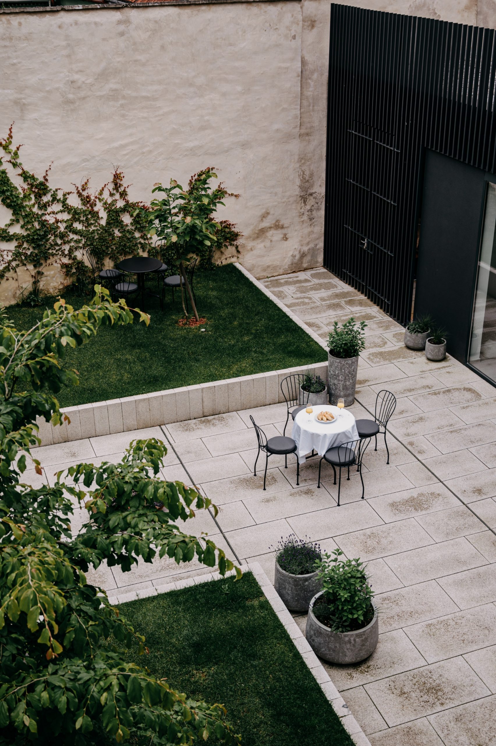 Betonsko dvorišče dopolnjuje veliko zelenja, dvignjene gredice ter studio, v katerem se nahaja recepcija in pop-up trgovina. Še eno pozitivno presenečenje, ki ga v samem centru mesta ne pričakujete ter navdihujoč pobeg od vsakdana.