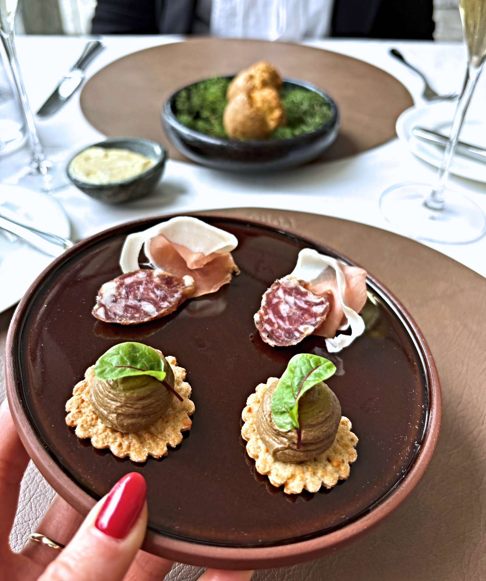 Očarljiv ambient in prijetna jazz glasba sta naju pobožala tako kot tridelni pozdrav iz kuhinje ter odlična penina kleti Slapšak. Na zunaj hrustljavemu in znotraj mehkemu briošu so družbo delali slano domače maslo, mesnine ter jetrna pašteta na krekerju. Precej obilen Amuse-bouche je bil odlična popotnica za najin nadaljnji 5-hodni meni.