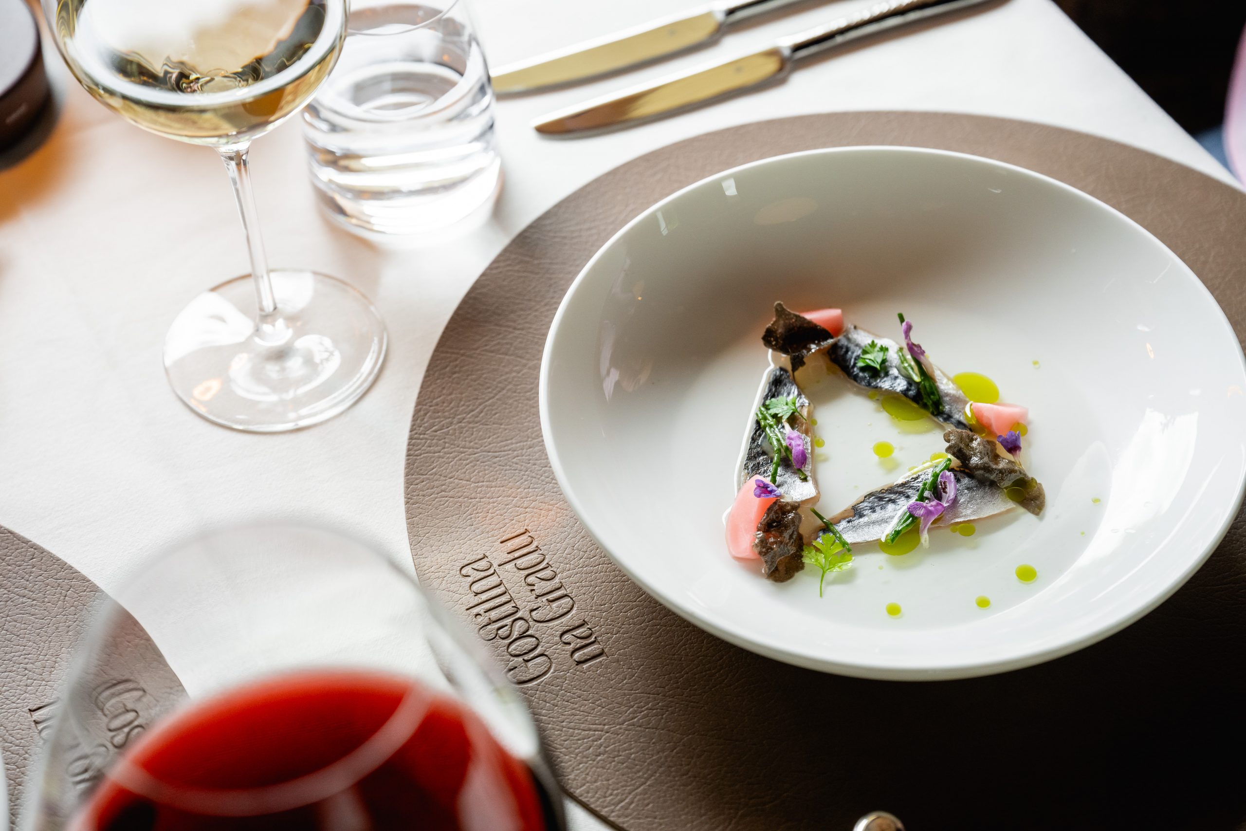 Kaja je izbrala ribji meni, sama pa sem se odločila za mesnega, tako da sva lahko poskusili čim več jedi. Ribja hladna predjed skuša in limona je bila kombinacija marinirane skuše, umami ribje juhe, čipsa črne rižote z gelom limone, vloženo rdečo redkev ter osočnikom.