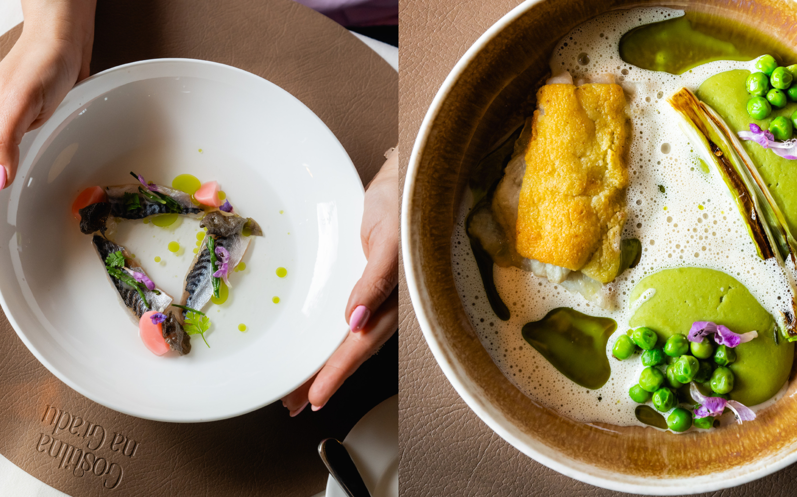 Kaja je izbrala ribji meni, sama pa sem se odločila za mesnega, tako da sva lahko poskusili čim več jedi. Ribja hladna predjed skuša in limona je bila kombinacija marinirane skuše, umami ribje juhe, čipsa črne rižote z gelom limone, vloženo rdečo redkev ter osočnikom.