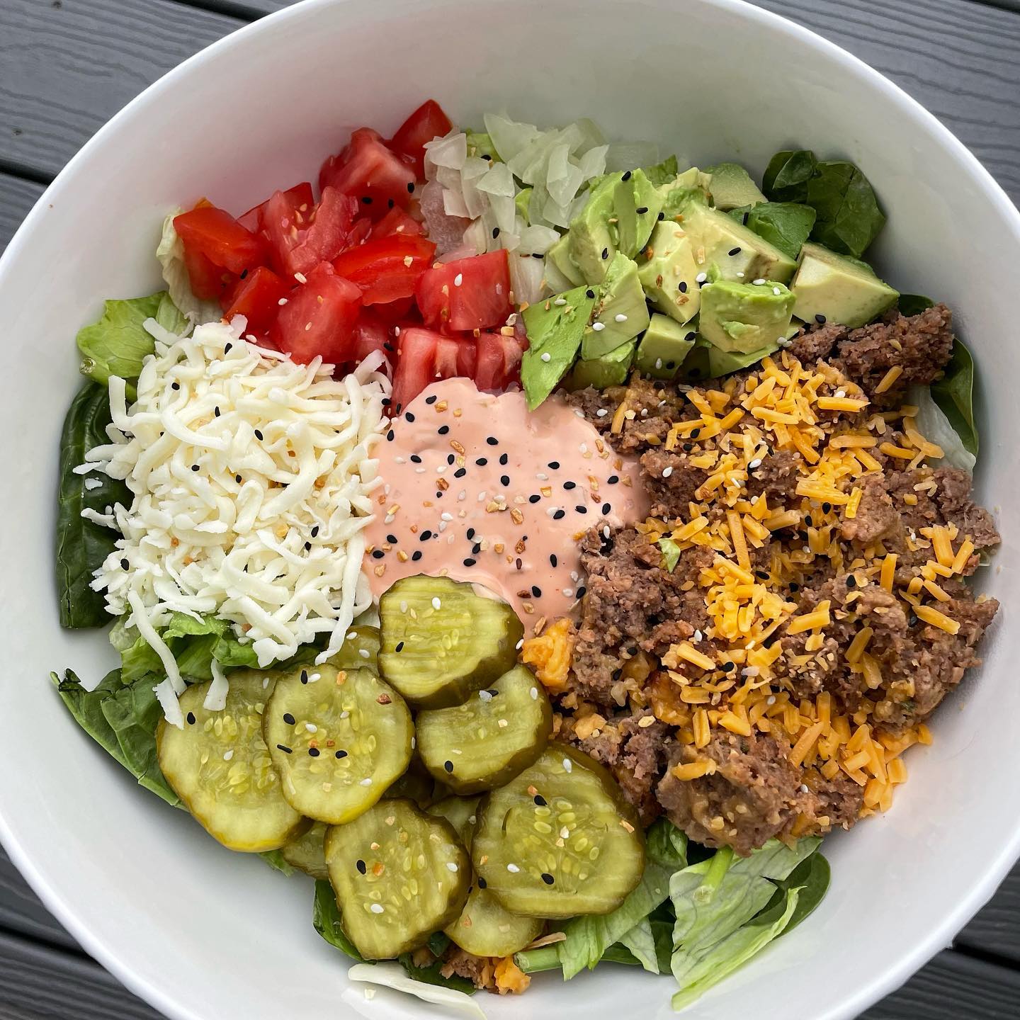 - Mleto meso pripravite z navedenimi začimbami in ga zmešajte z zeleno solato, cheddar sirom, kislimi kumaricami in krutoni (ki so lahko domači ali kupljeni). Na koncu dodajte še omako in voilà – Big Mac solata je pripravljena. Dober tek!