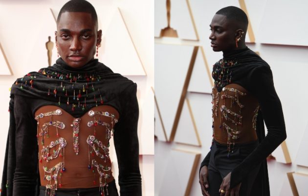 Očitno so sončna očala nov nepogrešljiv modni dodatek na rdeči preprogi. Z njimi je poziral tudi Jared Leto, ki s svojo nenavadno opravo ni ostal neopažen. Oblečeno je imel prosojno majico s črnimi perlicami, čez njo pa ogrnjen težek plašč s kravjim vzorcem na rokavih. Celotno Guccijevo opravo je zaključil z belimi kavbojskimi čevlji in nizom srebrnih verižic.