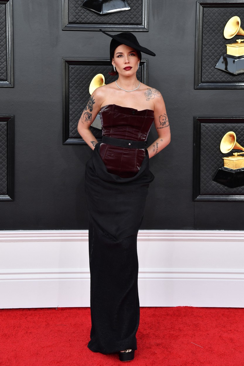 Podoben model obleke je izbrala Halsey. Oblečen je imela žameten steznik z žepi, ki ga je kombinirala z dolgim črnim krilom. Piko na i sta celotni opravi dala biserna ogrlica in eleganten klobuk.