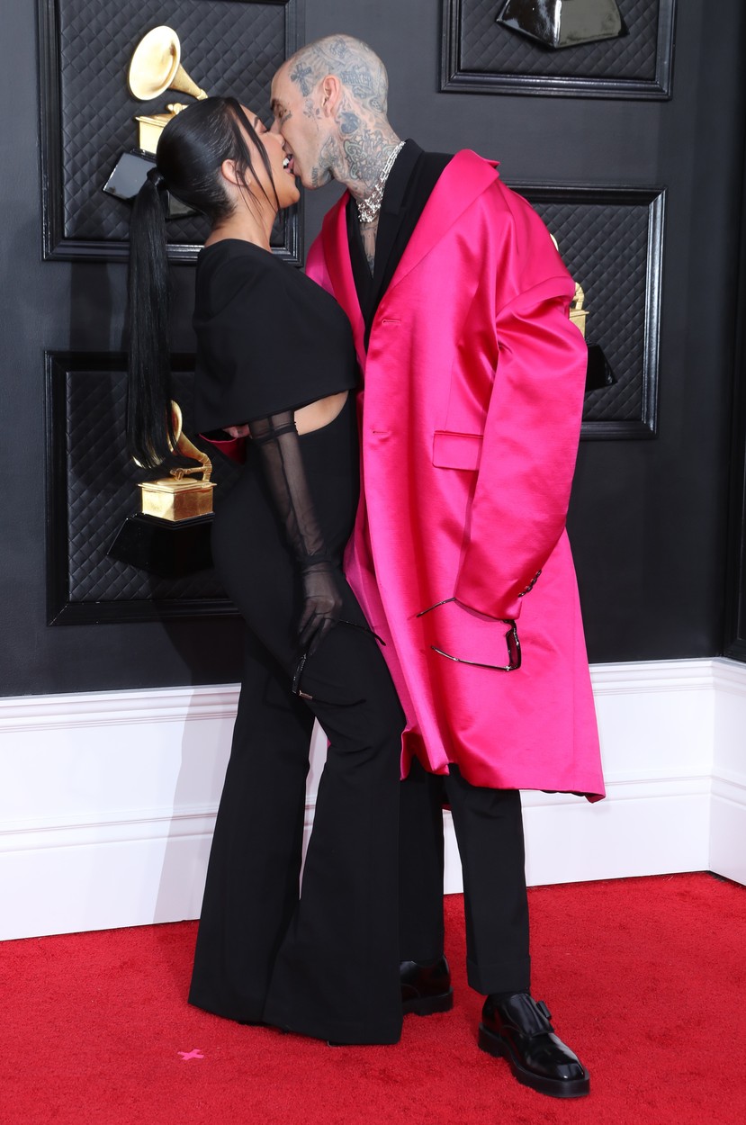 Kourtney Kardashian in Travis Barker, ki je presenetil s pink plašečem, tudi tokrat nista zmogla pozirati brez strastnih poljubov …