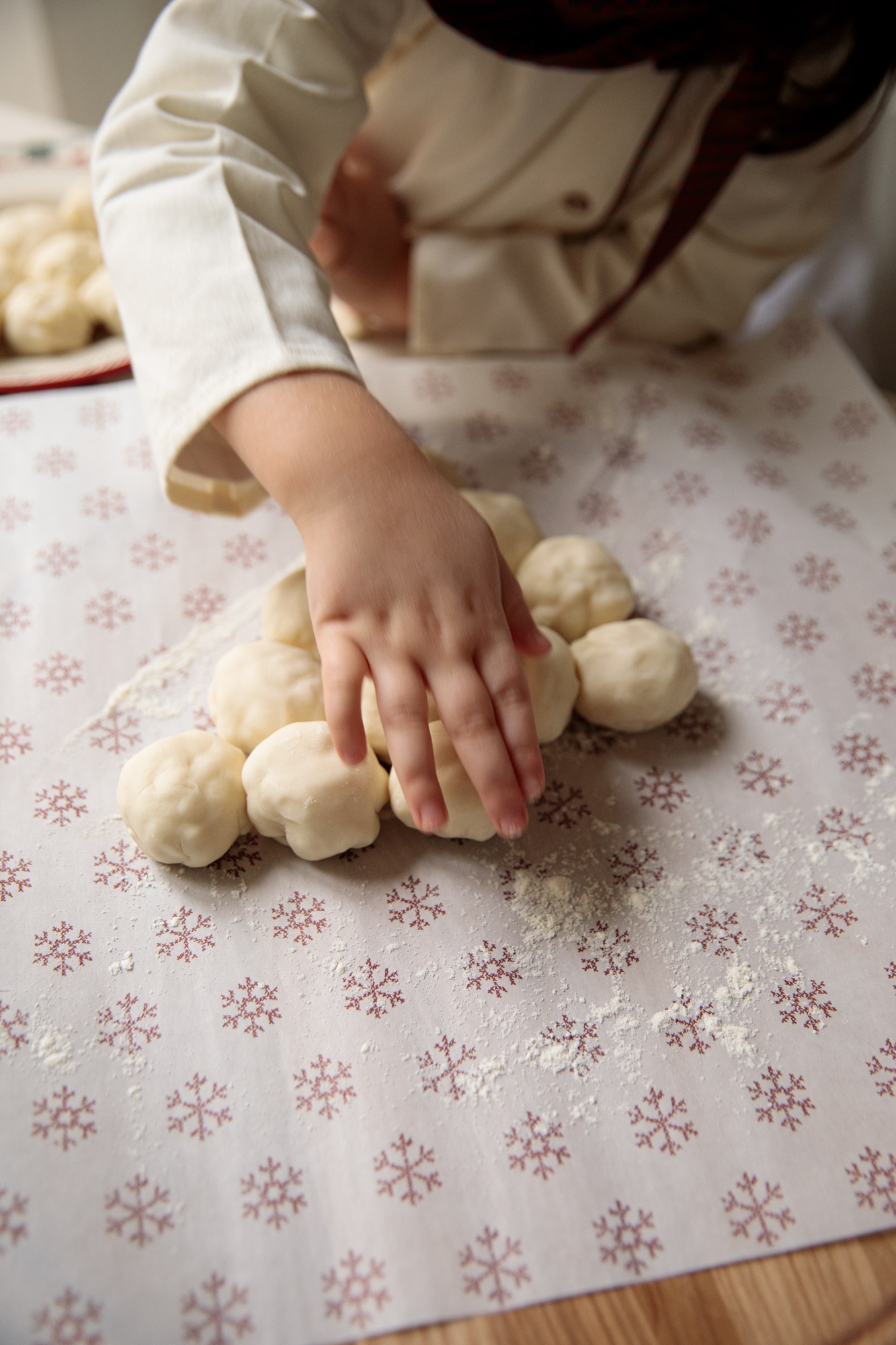 2. Maso raztegnite in razrežite na 4 cm velike kroge. Na vsak krog položite mocarelo in oblikujte kroglico.