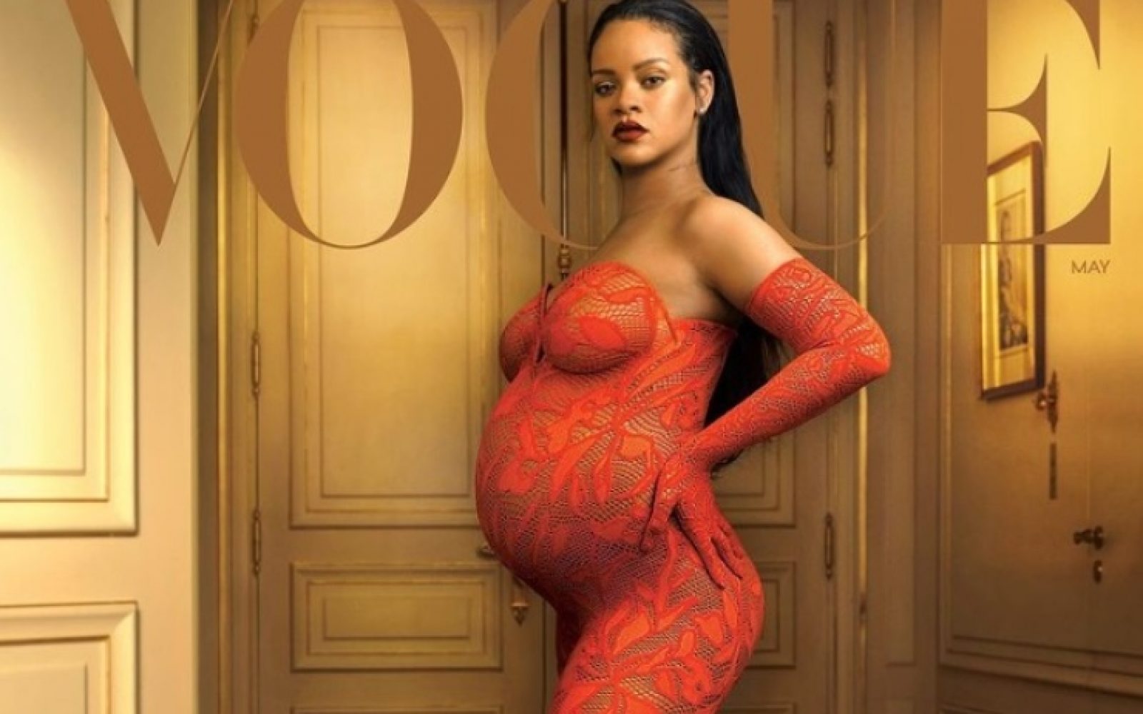 In v tem slogu krasi tudi majsko naslovnico revije Vogue, na kateri je oblečena v tesno oprijet enodelni kombinezon iz rdeče čipke modne hiše Alaïa, rokavice in visoke pete. Bodočo mamico je v objektiv ujela slavna fotografinja Annie Leibovitz.