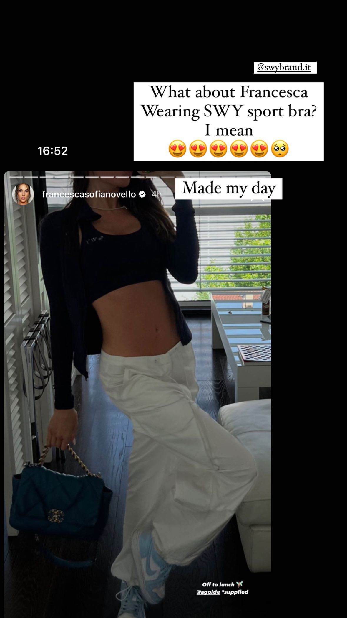 Francesca Sofia Novello je na Instagram storyjih objavila dve fotografiji, na katerih nosi športni modrček SWY, znamke, ki jo je ustanovila naša uspešna vplivnica Petra Parovel.