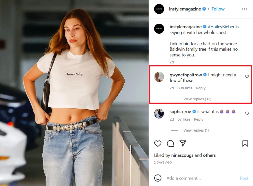 Pri tem so jo že podprli nekateri drugi “nepo otroci”, med njimi Gwyneth Paltrow, ki je na Instagramu pod Haileyjino fotografijo zapisala, da si mora tudi sama omisliti nekaj takšnih majic.