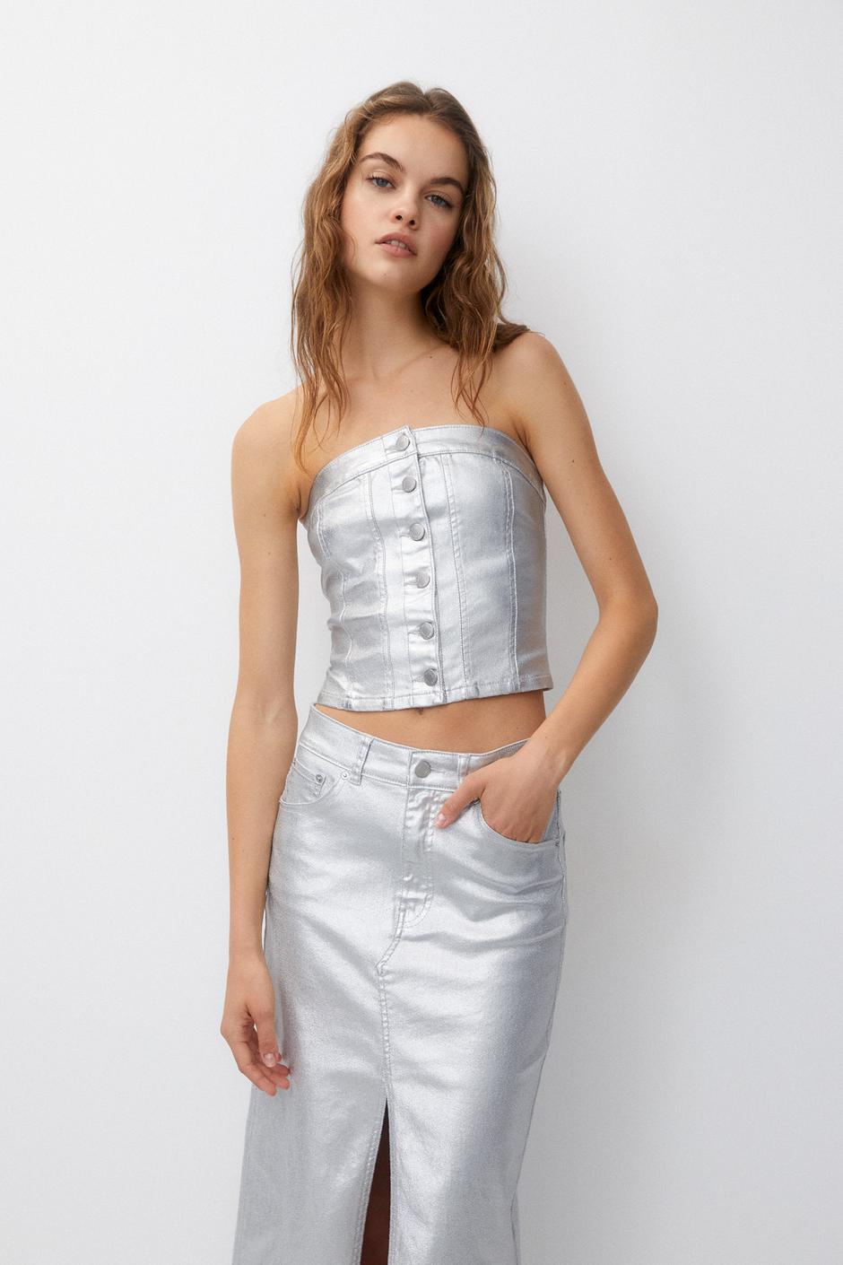 Zgornji del korzeta na sprednji strani krasi vrsta gumbov, maksi krilo pa je narejeno iz enako sijočega metalik jeansa, v klasičnem modelu z razporkom na sredini.