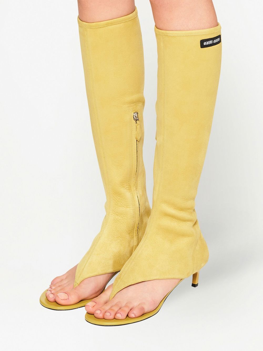 Gre za nekakšno mešanico med škornji in japonkami – v sprednjem delu so namreč odprti in imajo majhno petko. Pri znamki Miu Miu so škornje poimenovali visoki ‘škornji s tangicami’, saj točno na njih tudi spominjajo.