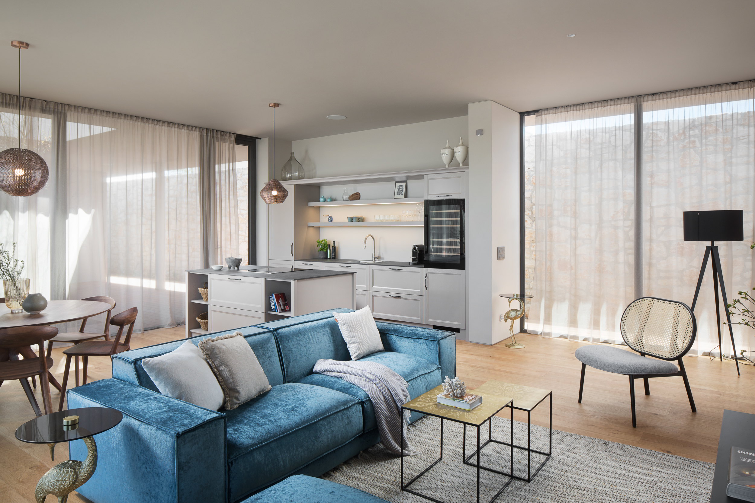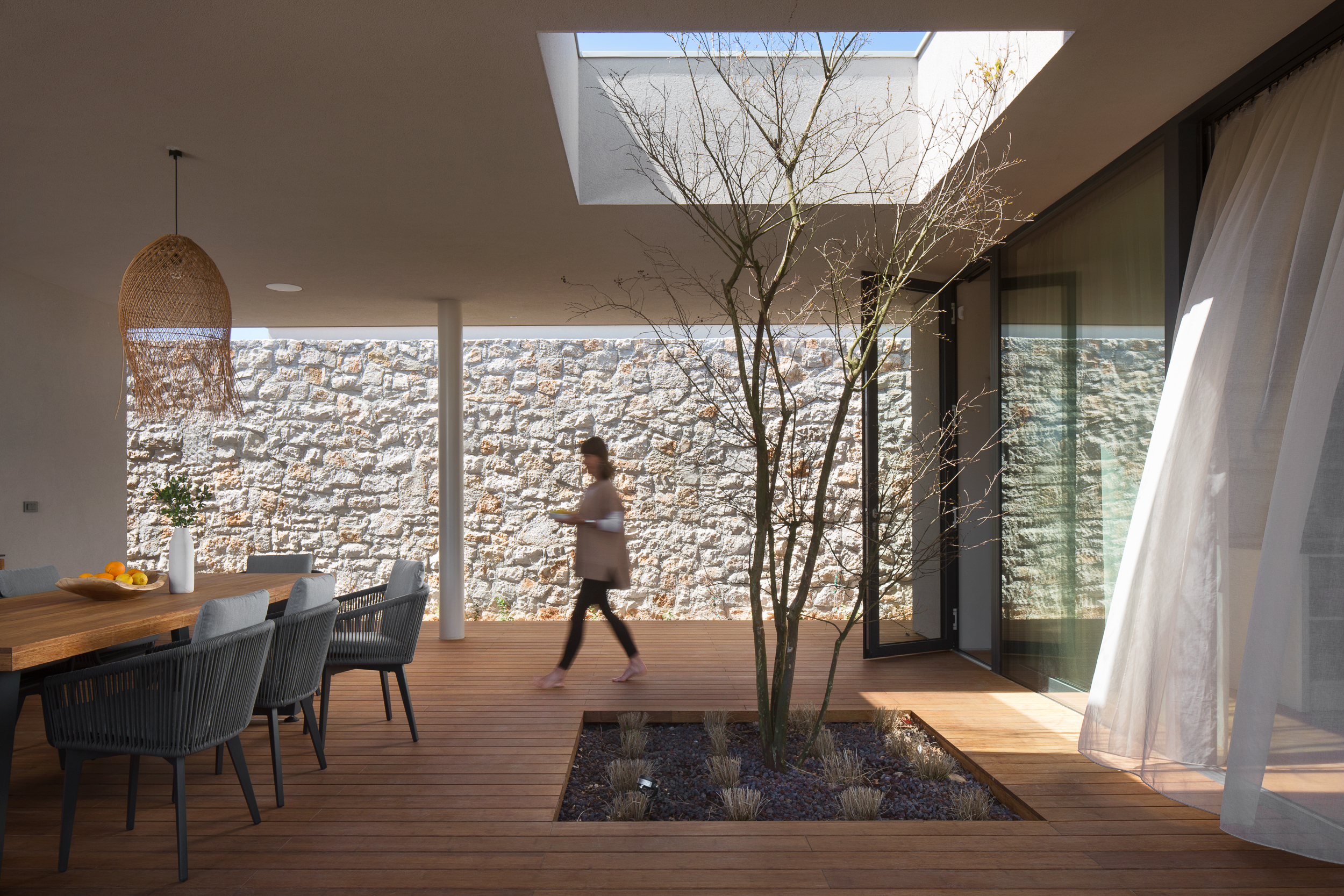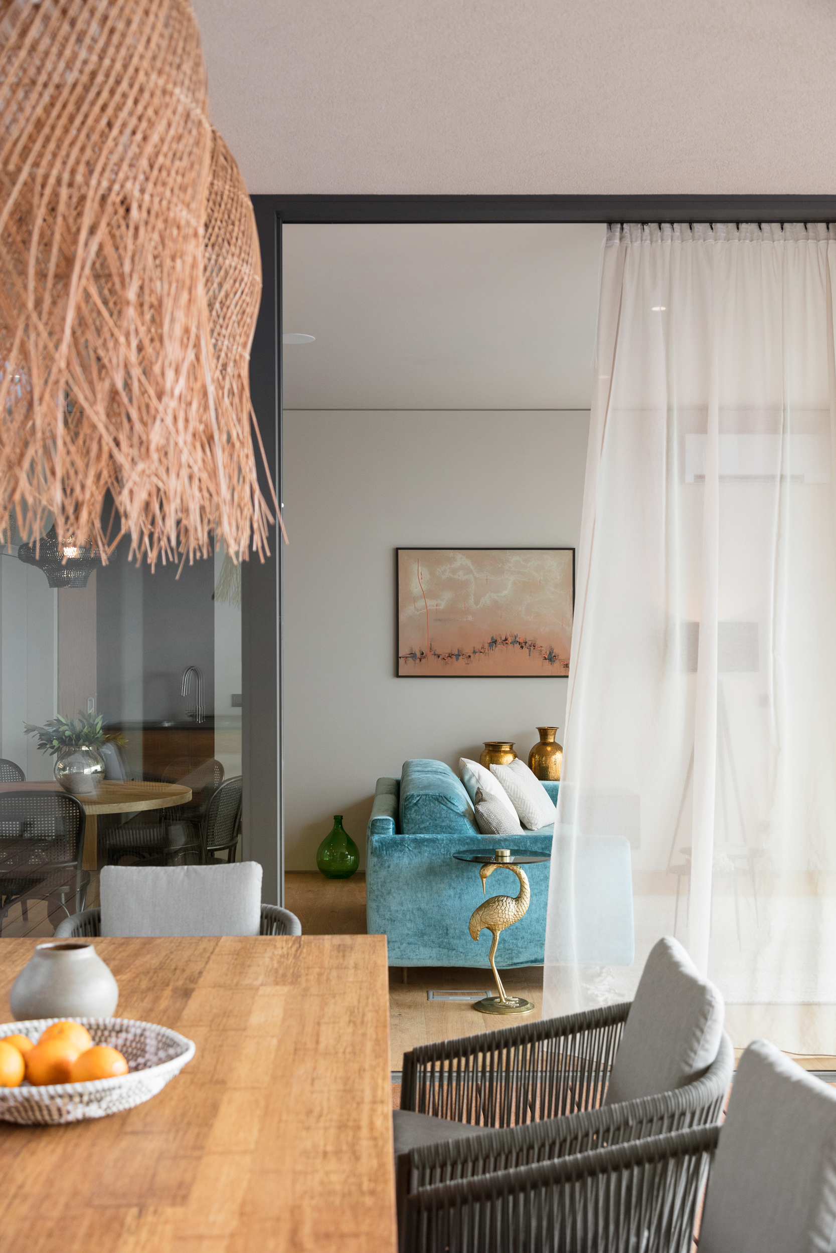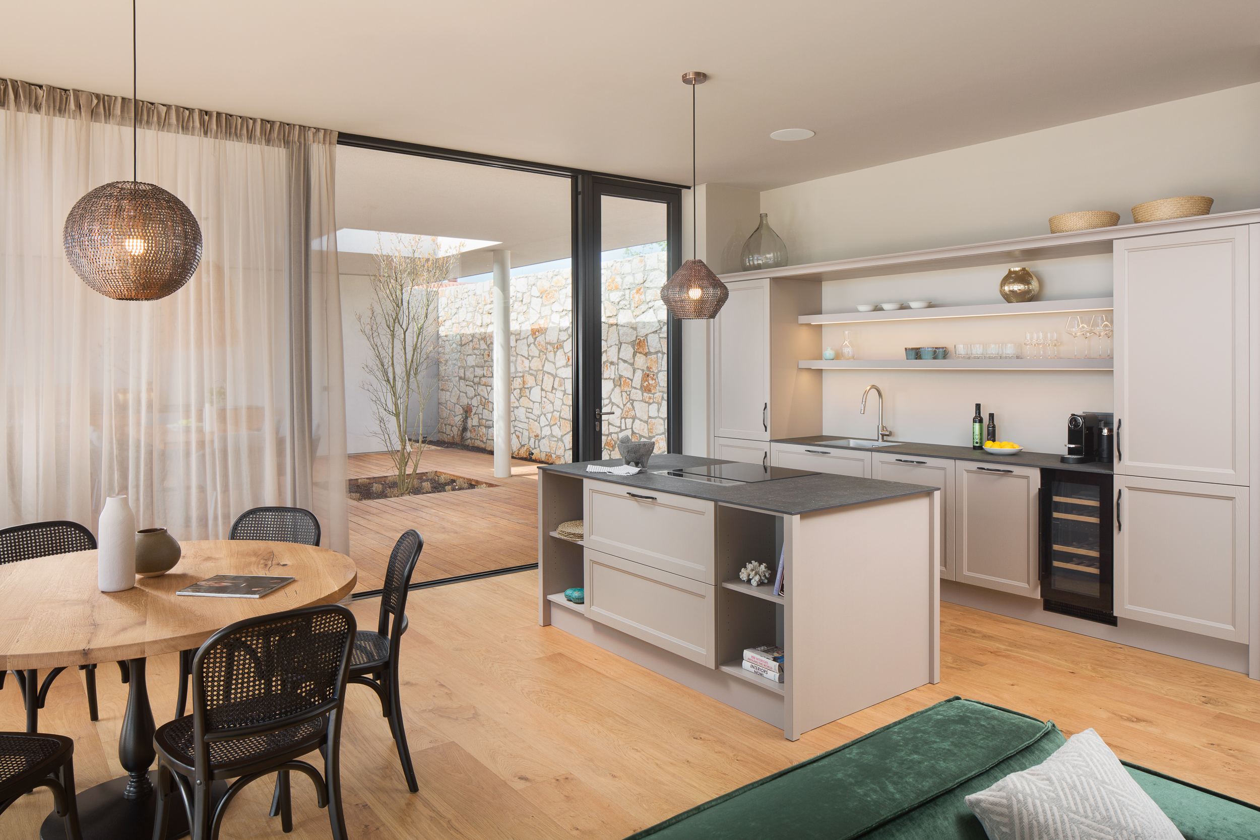 Notranjost je opremljena sodobno, a z mediteranskim pridihom, ki ob morju seveda ne uide. Morsko vzdušje je tako začutiti v ratanu, masivnem lesu, modri barvi, lahkotnih dodatkih, profiliranih ličnicah kuhinje in garderobnih omarah.