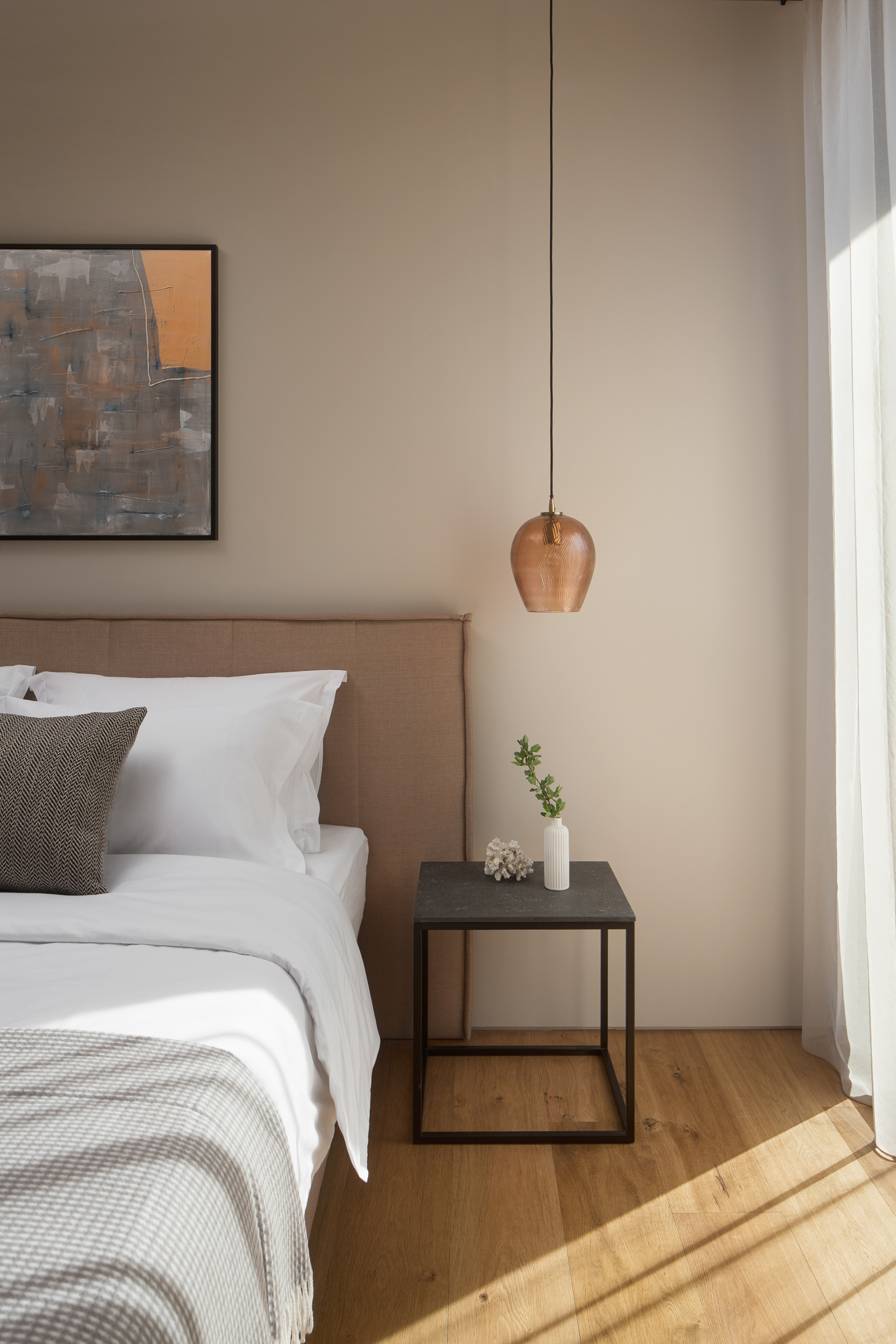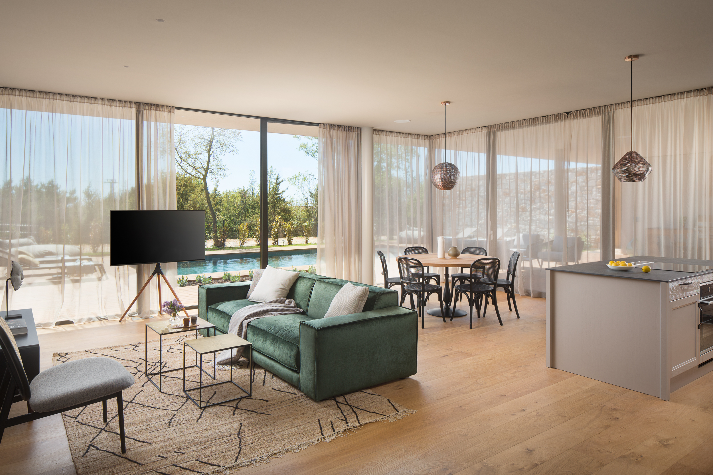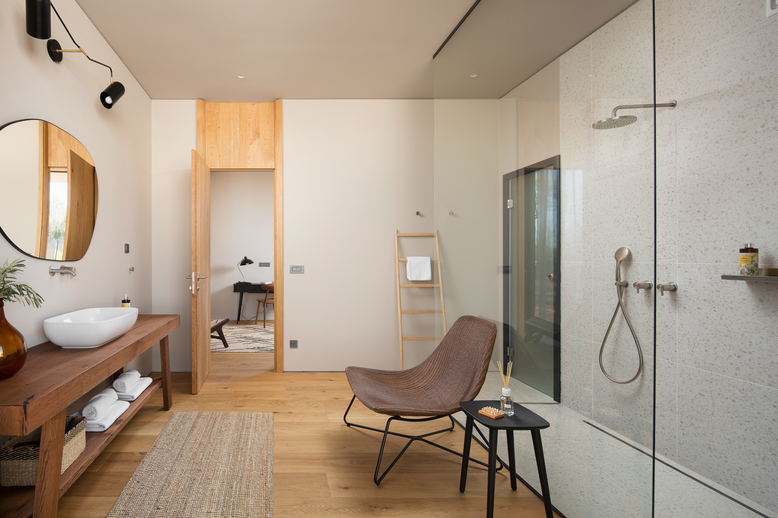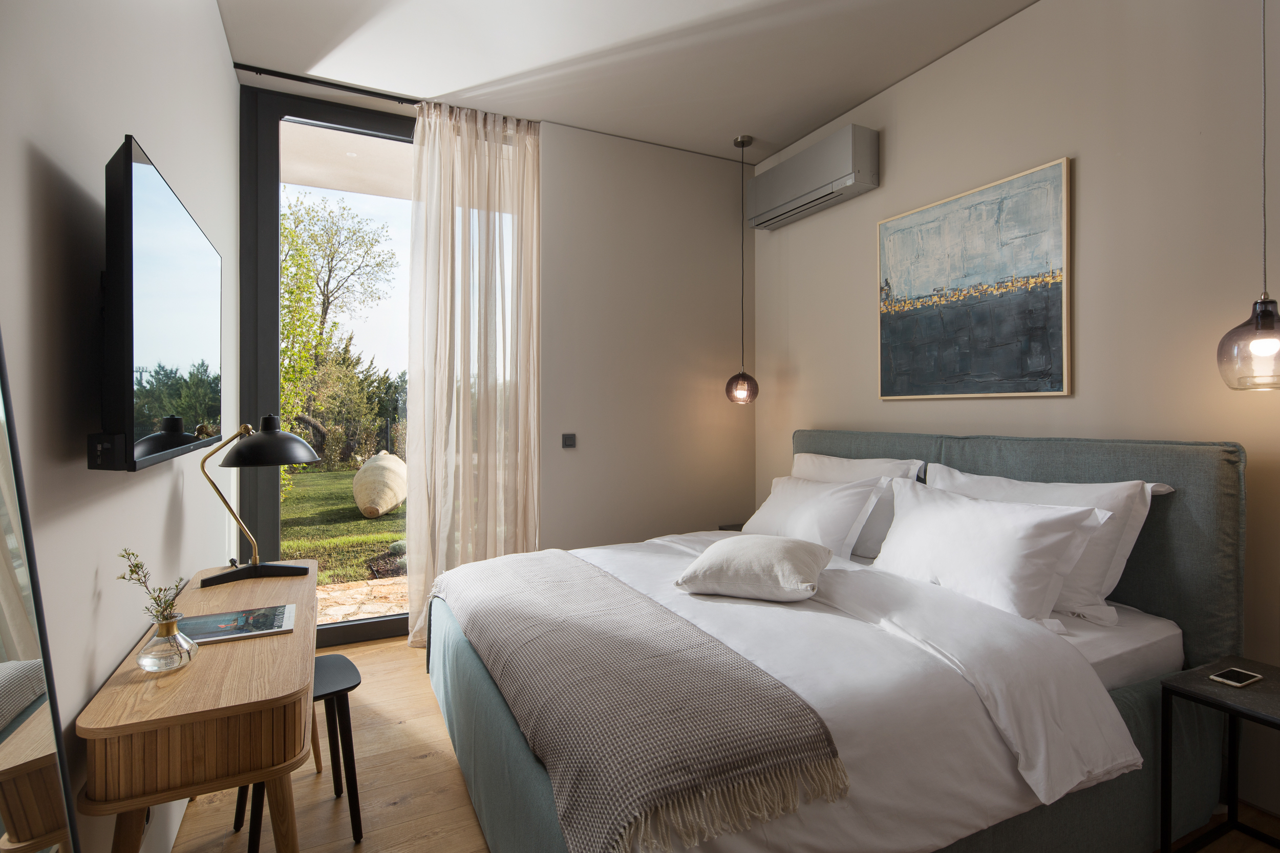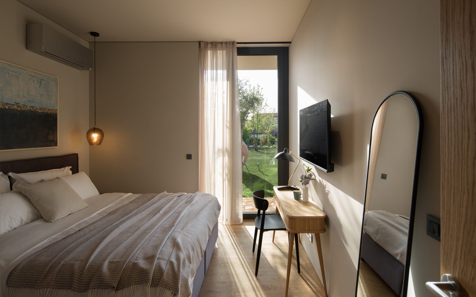 Spalnice vseh vil se z velikimi zasteklitvami odpirajo neposredno na teraso z bazenom in aromatičnim vrtom, ki ga krasijo skale in amfore.
